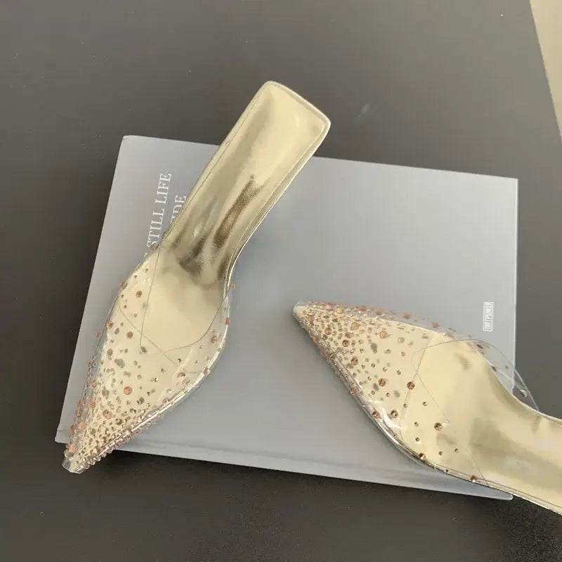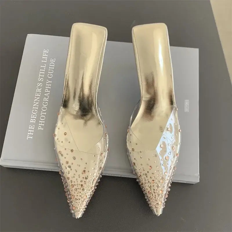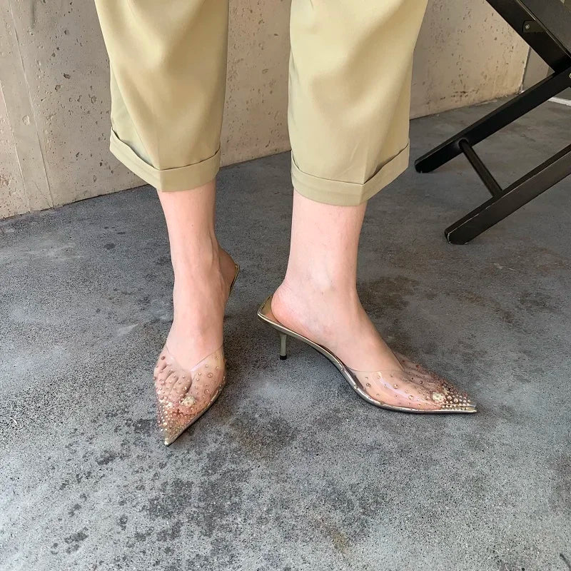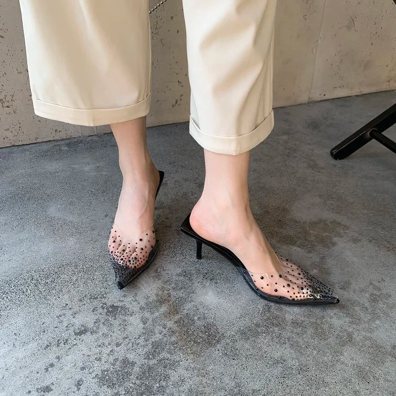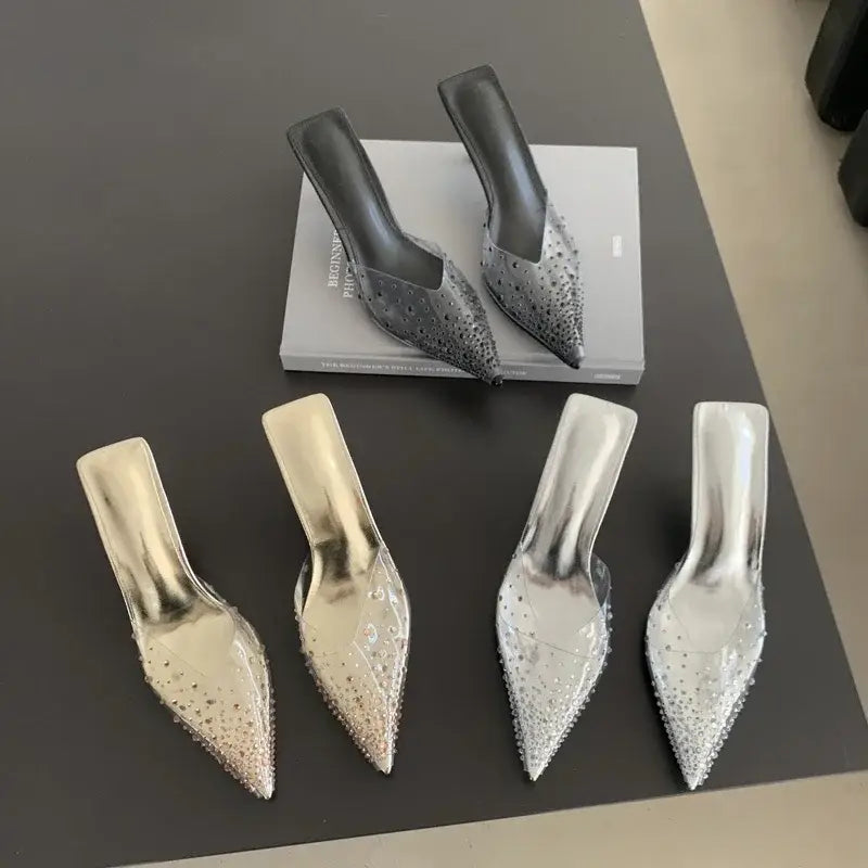 Elevate your footwear collection with these stunning rhinestone transparent mules. Featuring a clear upper adorned with sparkling rhinestone embellishments, these pump-style shoes offer a glamorous, eye-catching look perfect for special occasions or nights out. The transparent design creates an elegant, modern aesthetic while the rhinestone detailing adds luxurious sparkle. Comfortable and versatile, these mules work beautifully with dresses, skirts, or evening wear for a sophisticated finish.