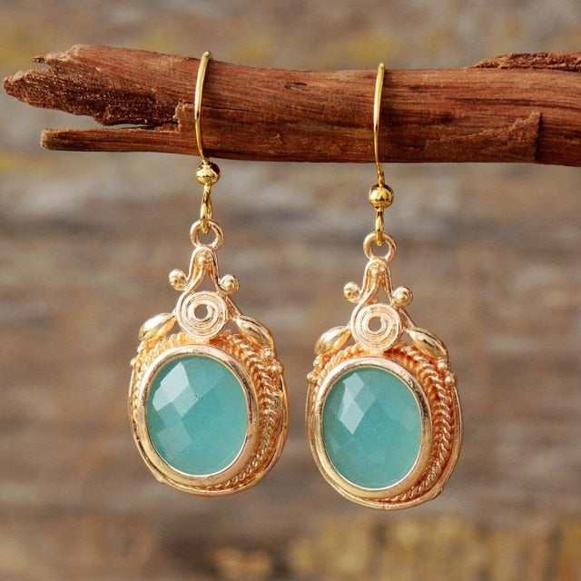 Copper Drop Dangle Earrings with Hook Closure and Semi-Precious Stone