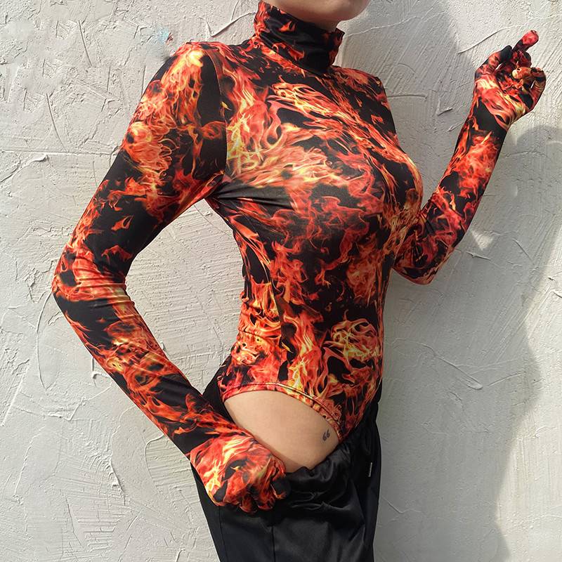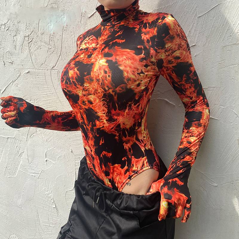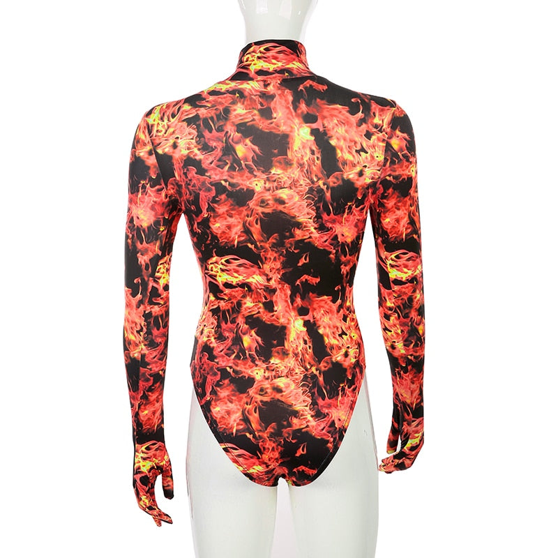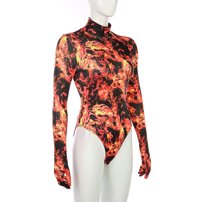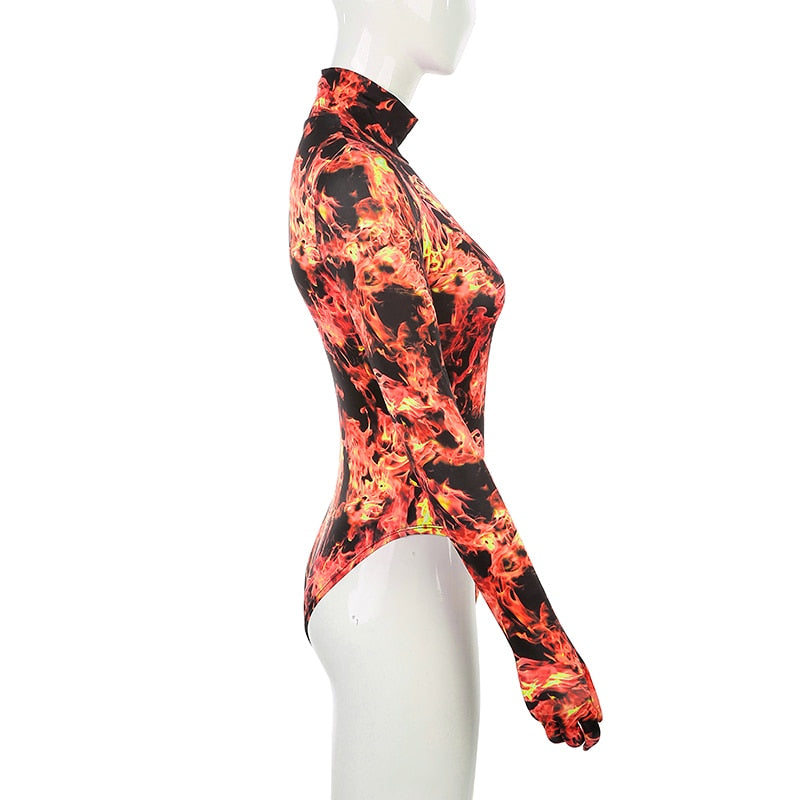 Polyester Spandex on Printed Fire Skinny Full Sleve Bodysuit