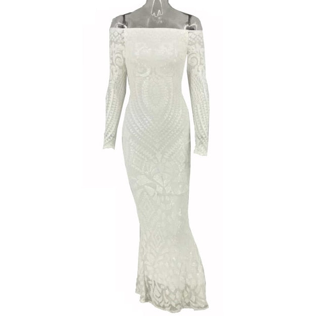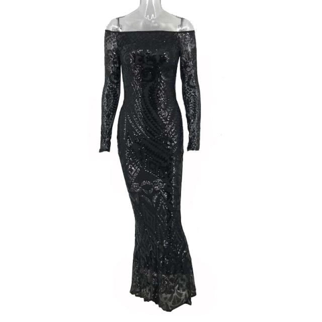 You're looking at a high-quality, beautiful dress that will make you stand out or be the life of the party. It's made of polyester mesh and it is floor-length with a long sleeve that is off-the-shoulder. The design features a beautiful patterned design.