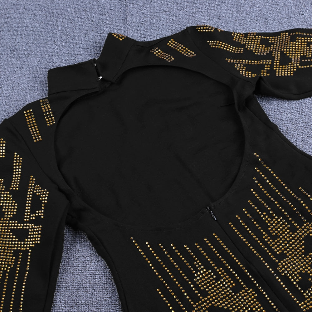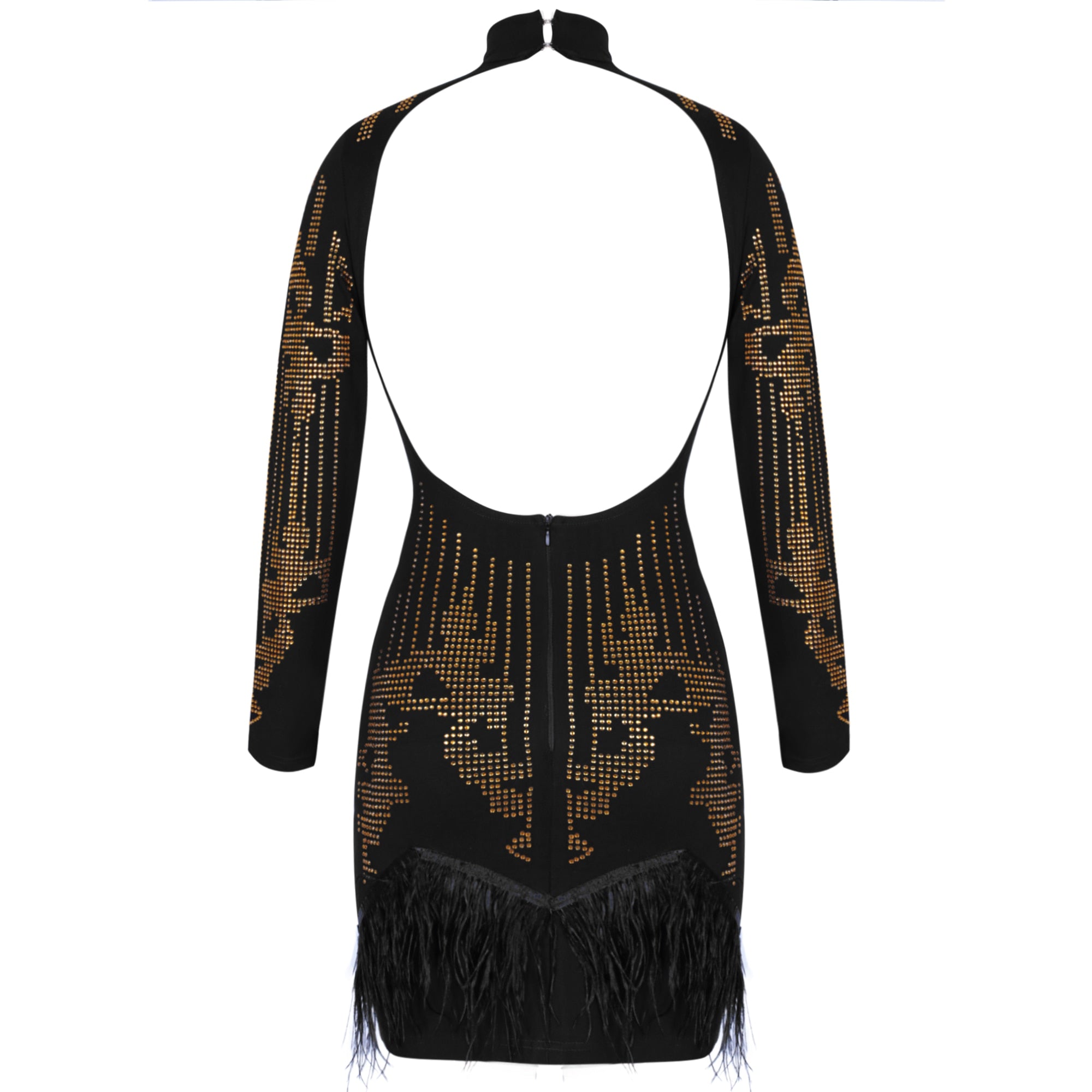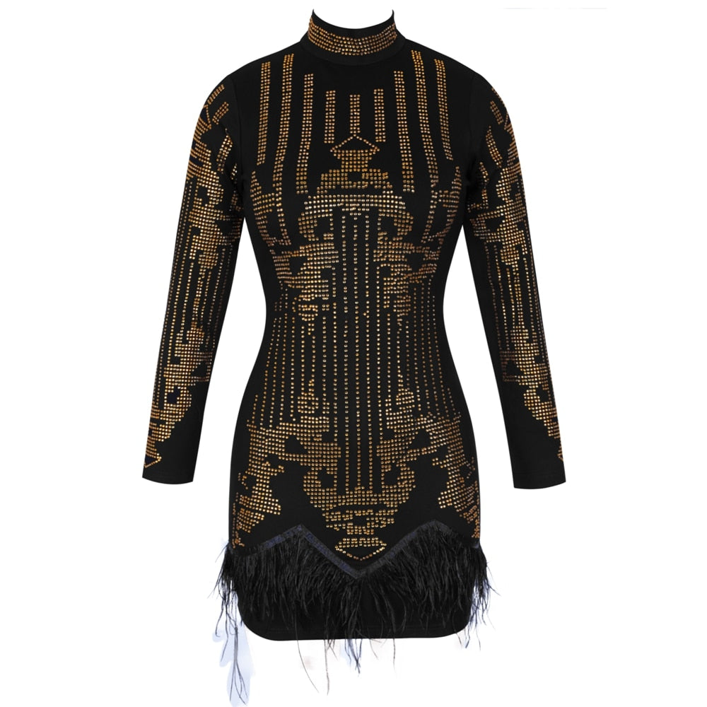 Polyester Nylon Rhinestone Feather Decoration Full Sleeve Bandage Mini Dress