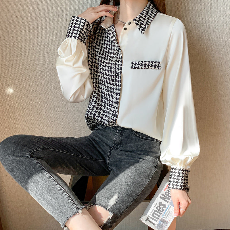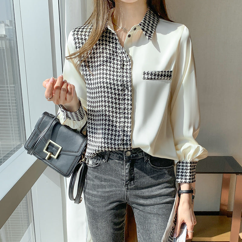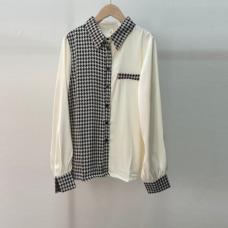 Long-Sleeved Turn Down Collar Shirt made from Polyester Material in Satin Fabric Type with Half Solid Color and Houndstooth Pattern