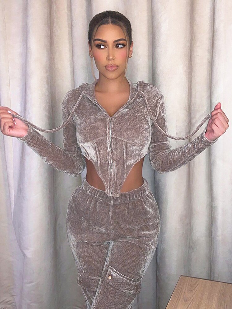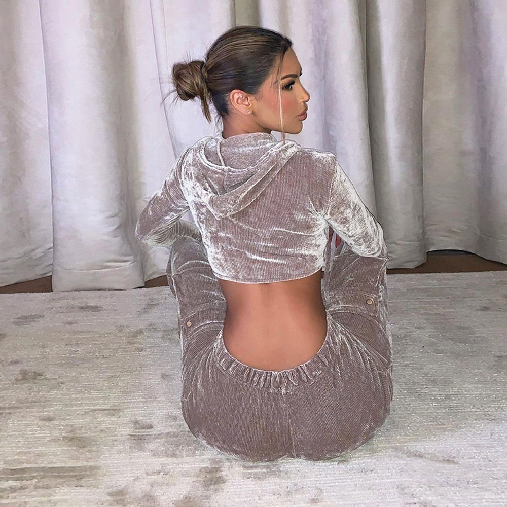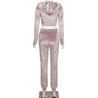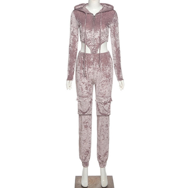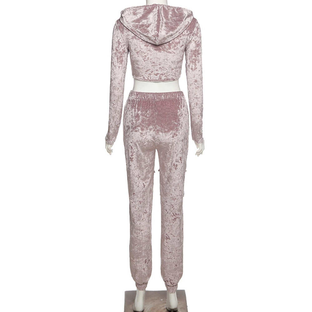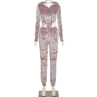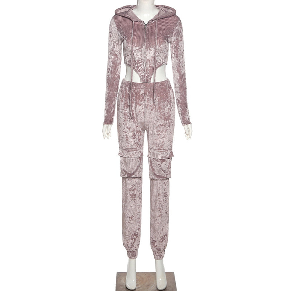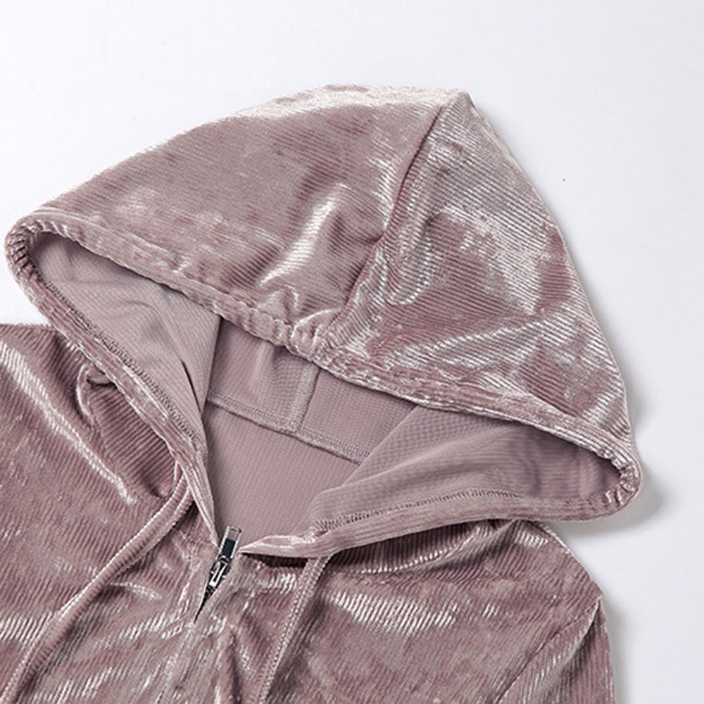Velvet Pant Sets with Hooded Collar, Elastic Waist, Zipper Closure, and Polyester Material