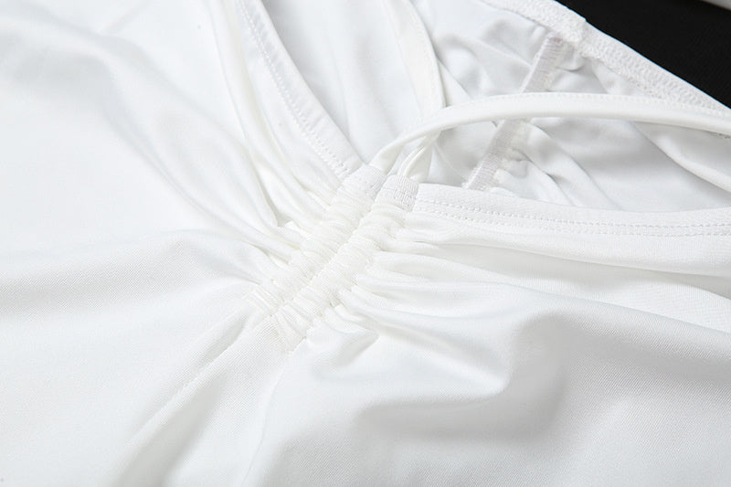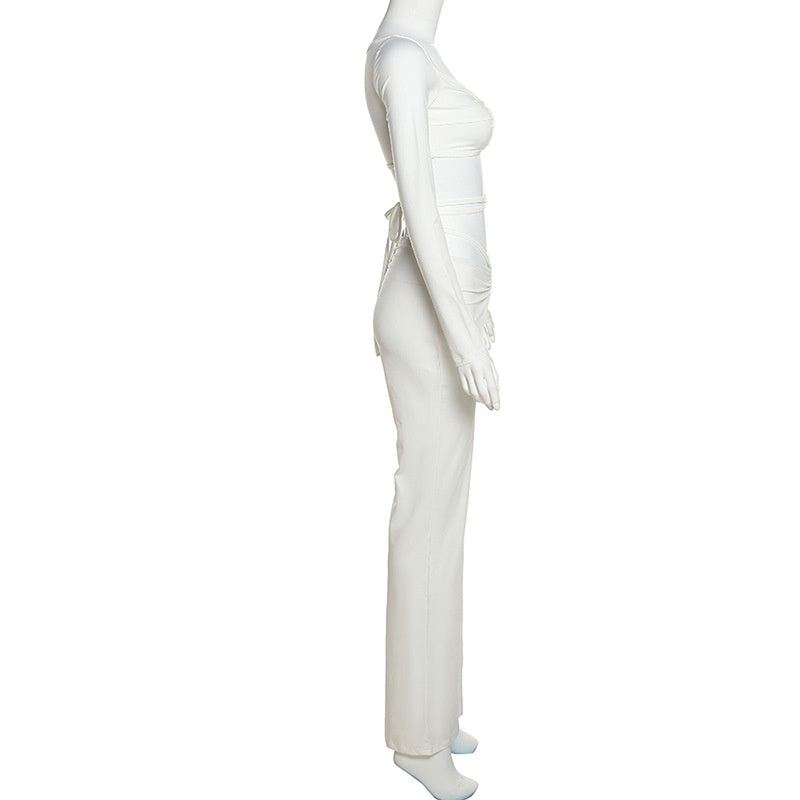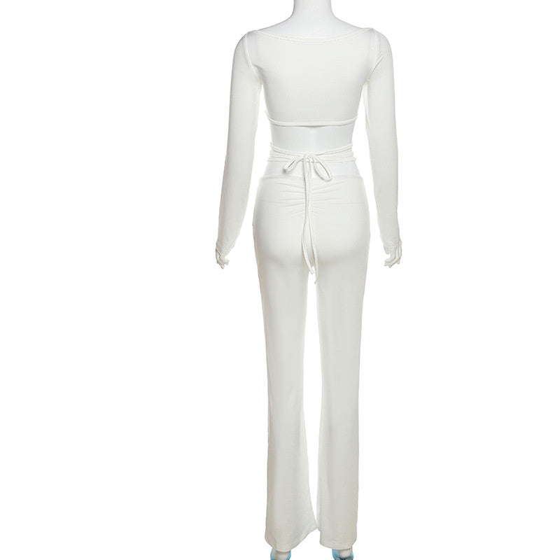 This pants set will keep you looking stylish while still being active. Made from spandex material, it is very easy and comfortable to wear. It features off-shoulder long sleeves with a sweetheart neckline and waist lace style. The ruched front also gives a simple accent to the basic full-length pants.