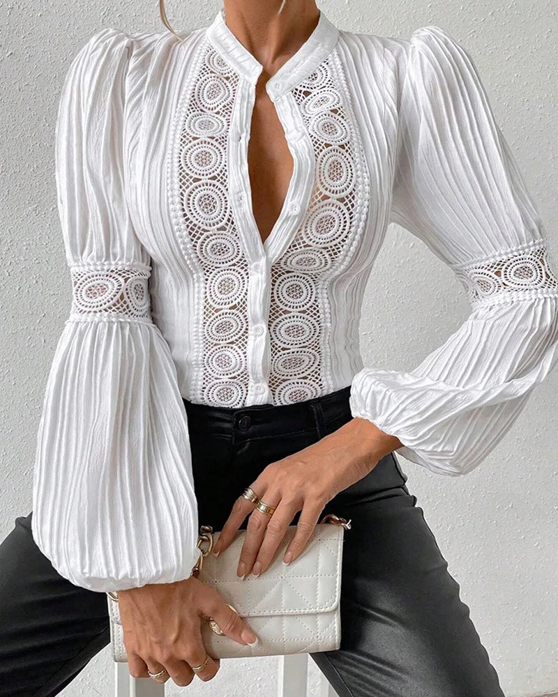 Indulge in elegant femininity with our blouse! Crafted with a solid polyester material, this blouse is both lightweight and durable. The hollow-out design adds a touch of allure, making it perfect for any occasion.