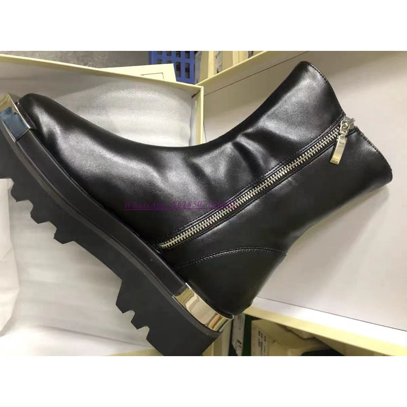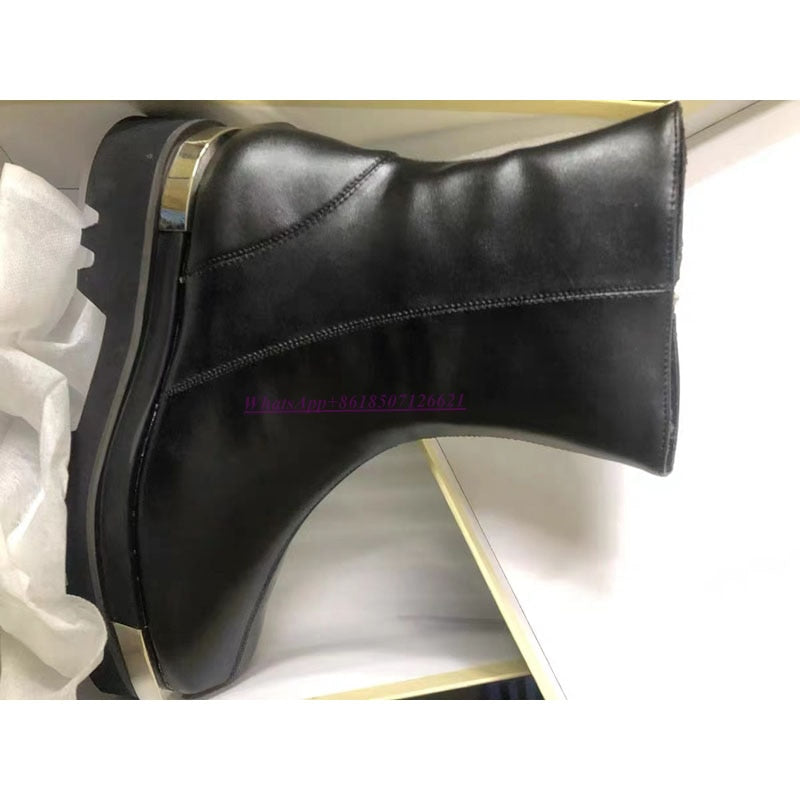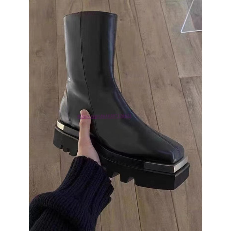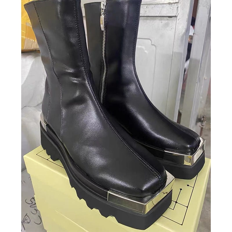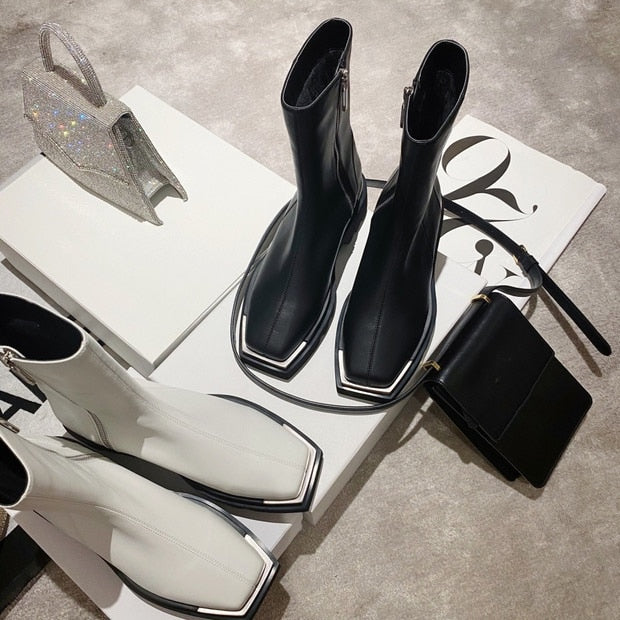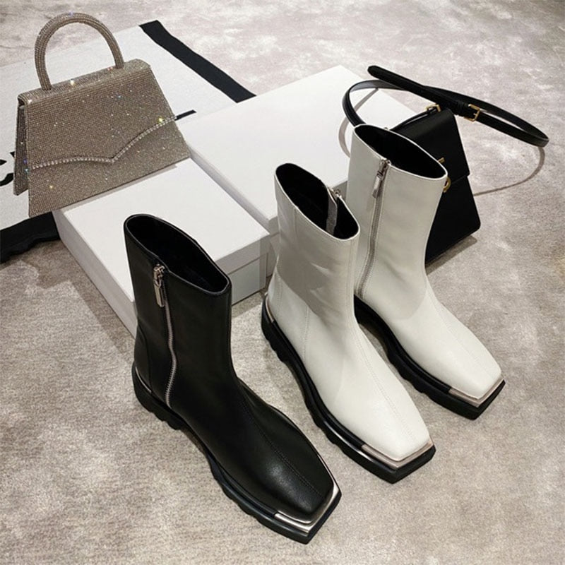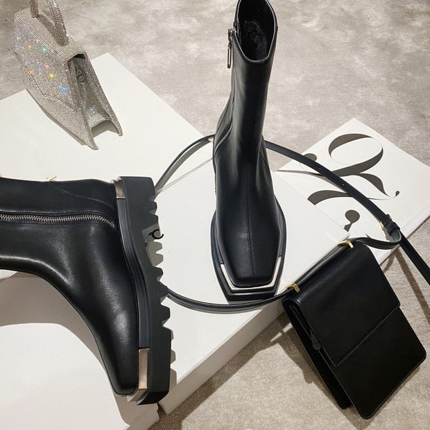 Luxury, quality and high-end design come together in these timelessly chic shoes. The midi boot has a sleek, classic silhouette with a shiny PU leather and a smooth zipper. A pair of matching, square heels completes the outfit.