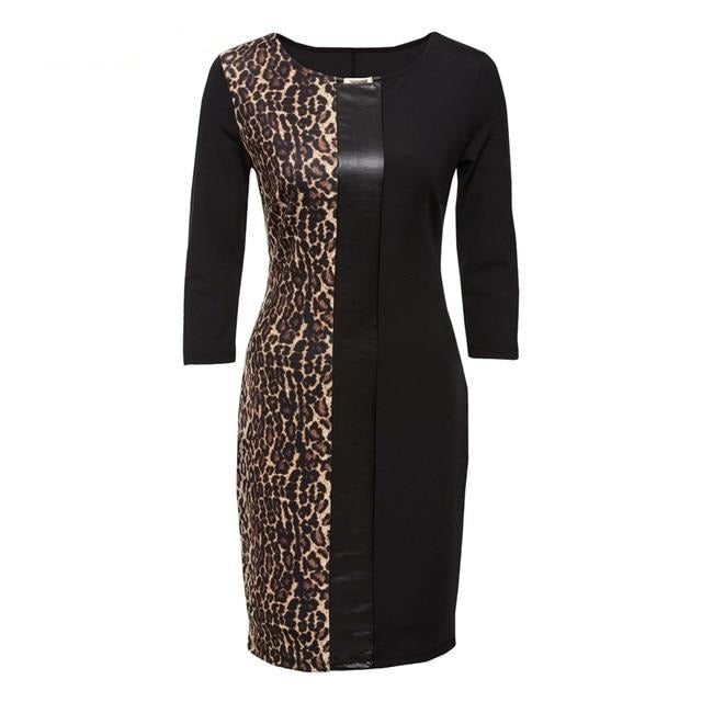 Long Sleeve O-Neck Collared Mini Dress with Leopard Pattern Decoration, Zipper Closure, and Polyester Material
