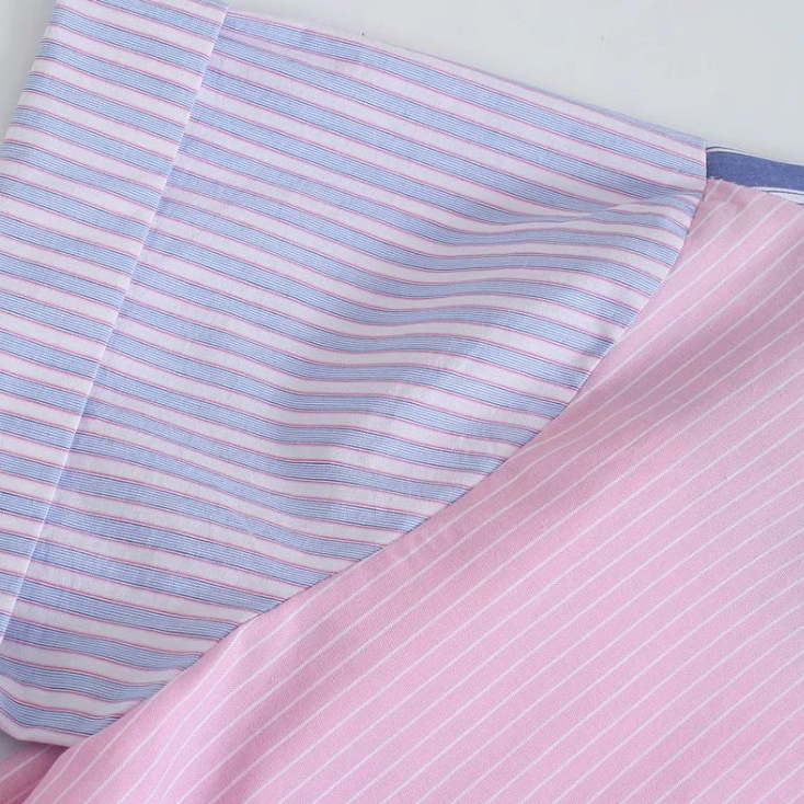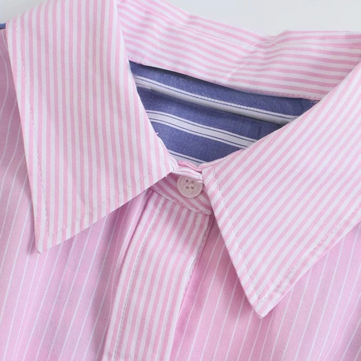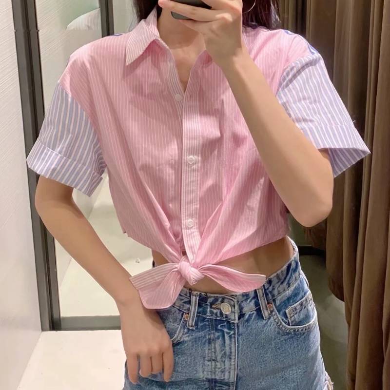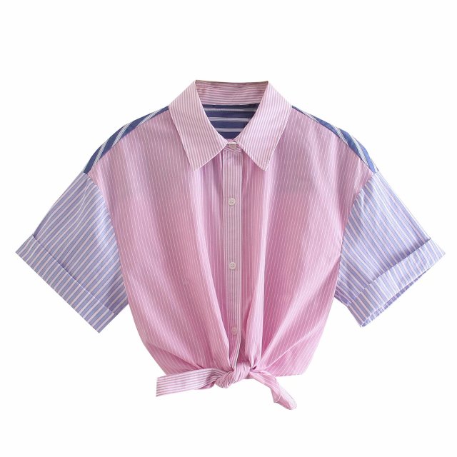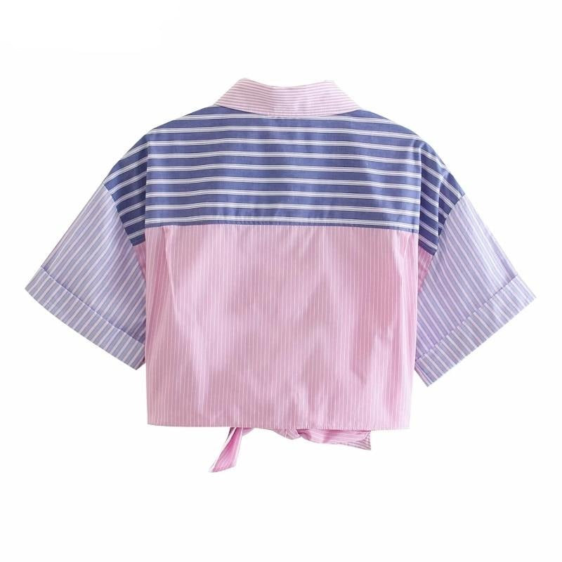 Short-Sleeved Shirt with Stripe Pattern, Turn Down Collar, and Bow Knot Decoration