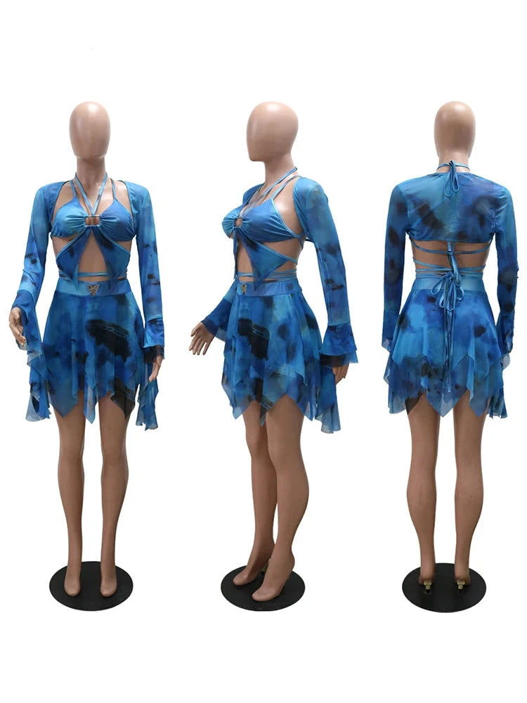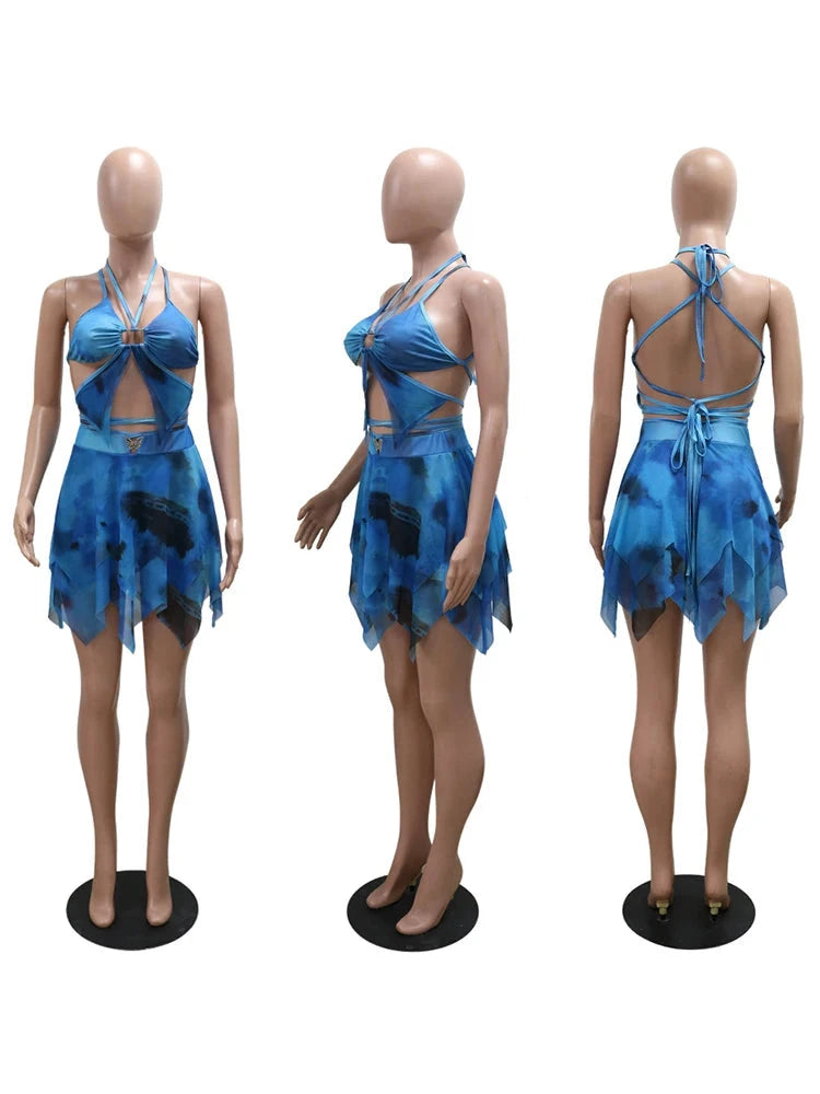 Elevate your style with this skirt set. Made with soft, lightweight polyester and featuring a unique print and delicate lace details, this skirt set is perfect for any occasion. Make a statement and feel effortlessly chic with this must-have piece.