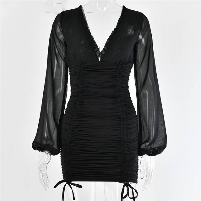 <transcy>Mini vestido ajustado de gasa con manga larga y cuello en V para mujer</transcy>