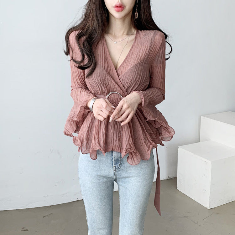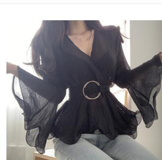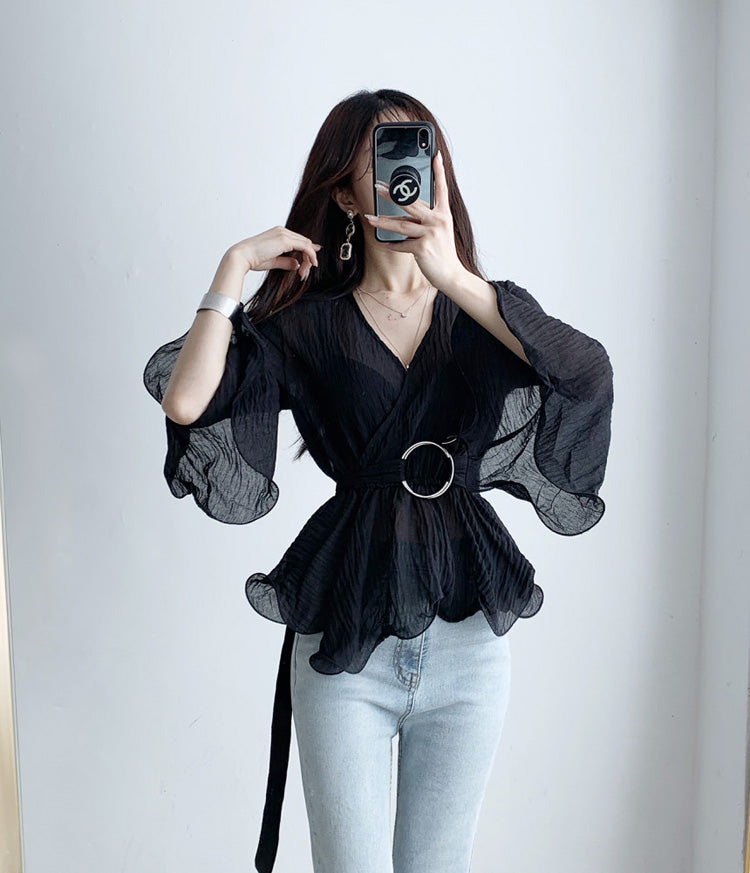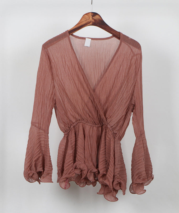 Blusa transparente con cuello en V con manga acampanada y material de gasa