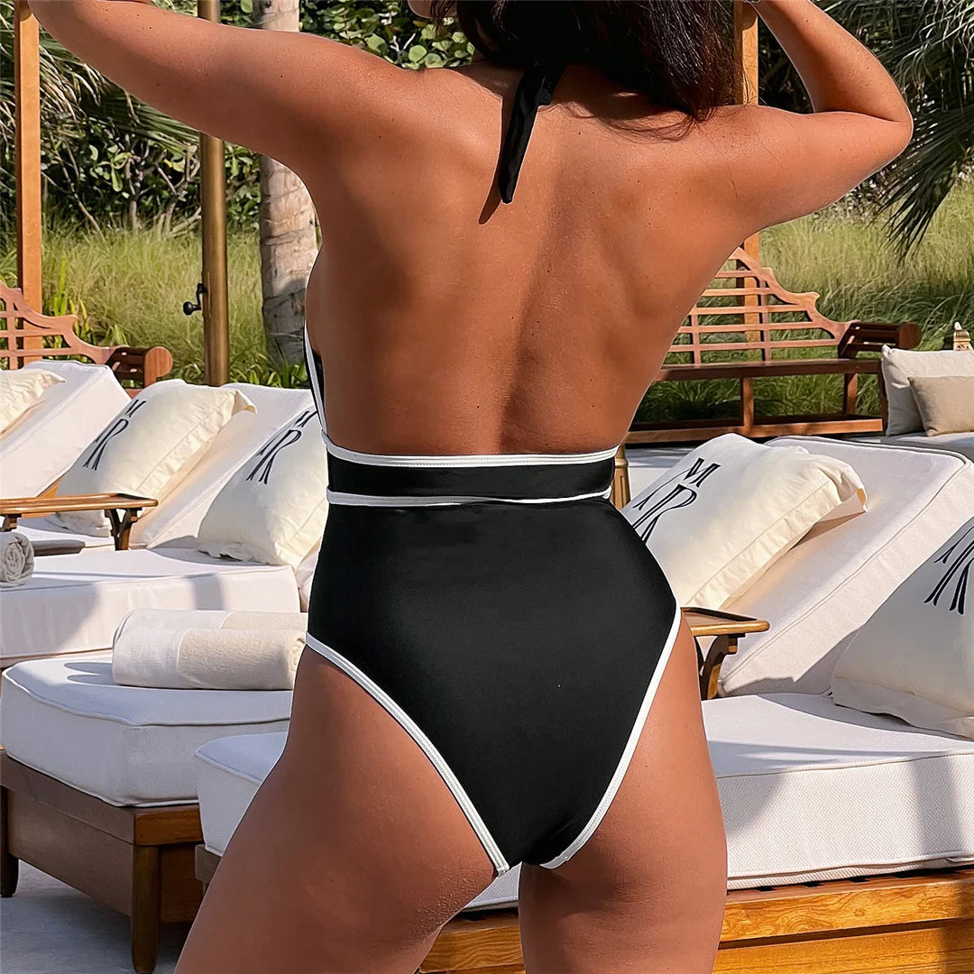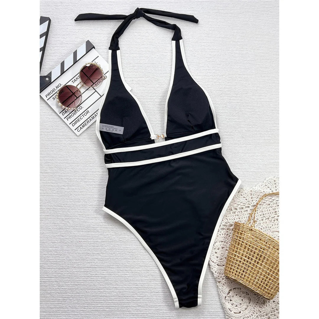 Make a bold statement in this striking deep V-neck halter monokini. The plunging neckline and sleek black design create a sophisticated, daring silhouette that flatters and commands attention. The halter strap provides secure support while the one-piece cut offers streamlined elegance. Perfect for confident swimmers and sunbathers who want to turn heads at the beach or pool. Versatile enough for resort wear or a night out by the water.