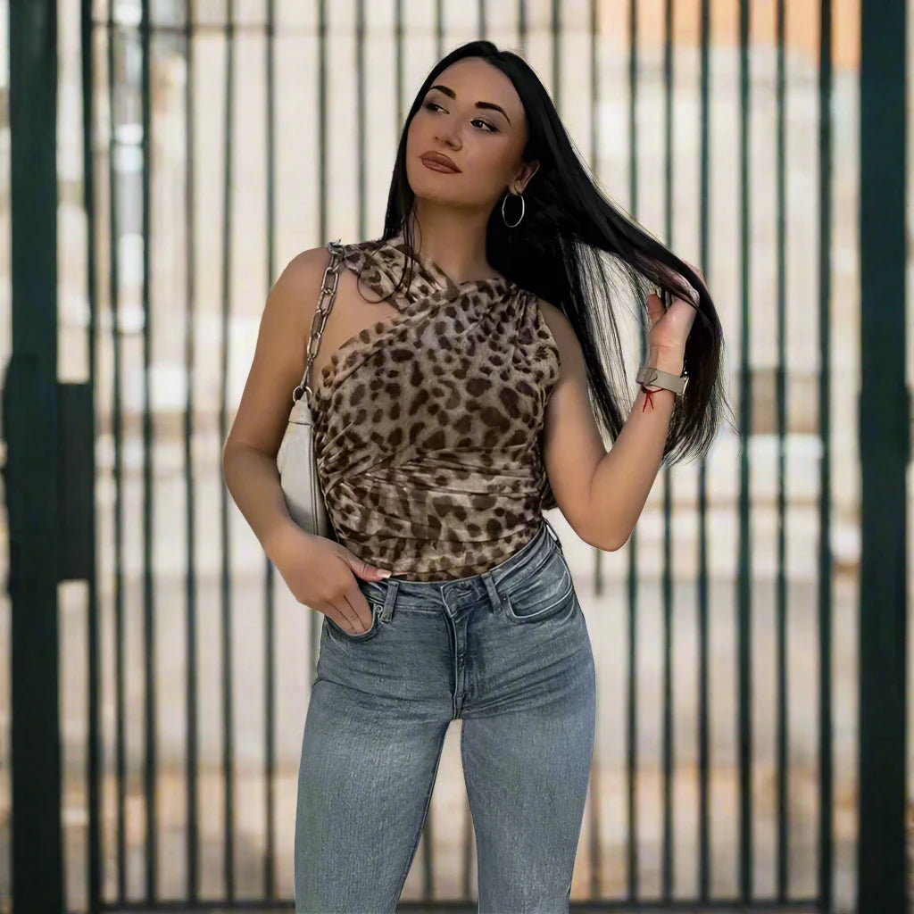 Unleash your wild side with the Eclipse Fantasy Bodysuit! The bold leopard pattern and chic folds add a touch of adventure to your wardrobe. Made with medium stretch polyester, it offers a slim fit that flatters your figure. Take on the day with confidence and style.