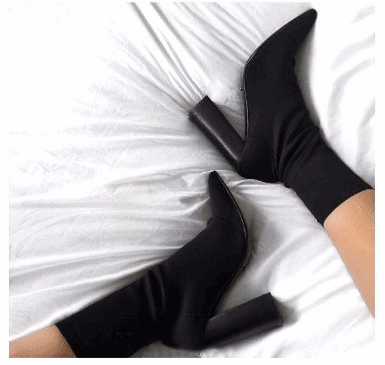 <transcy>Botines de mujer de tacones de punta puntiaguda elásticos de hilo elegante</transcy>