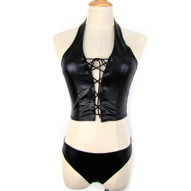Conjuntos de lencería con top halter con estampado sólido de cuero de PU