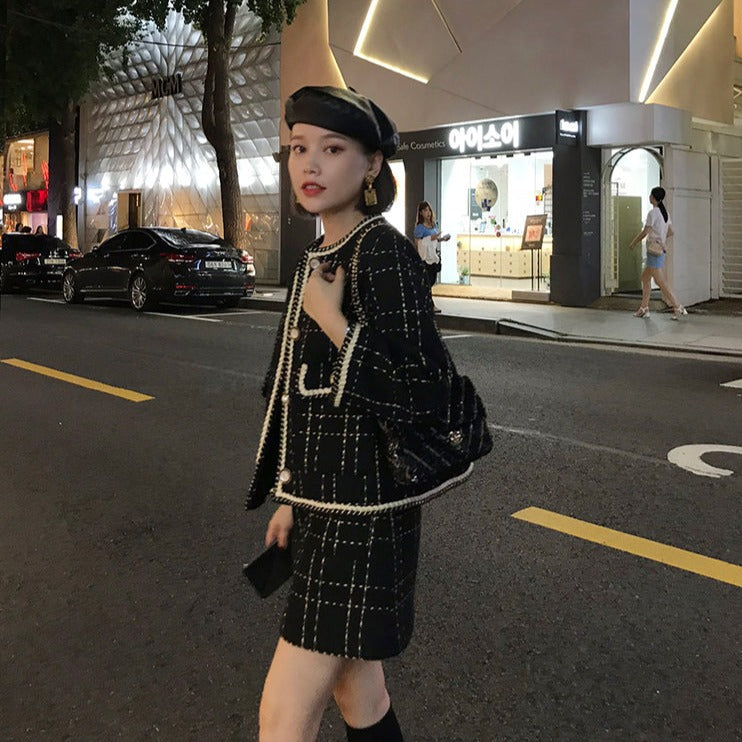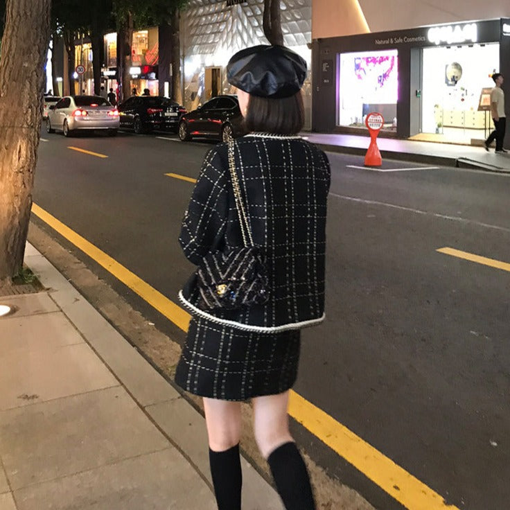 This women's skirt set includes a jacket and a mini skirt. The jacket is long sleeve and single-breasted. The skirt is mini and a-line. This skirt set is made of cotton and the color is black.