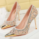 Glitter Affair Stiletto Heels dazzle with sparkling rhinestone patterns on a sleek PU upper. Featuring a sharp pointed toe, these heels offer a striking, fearless look that commands attention at every step.