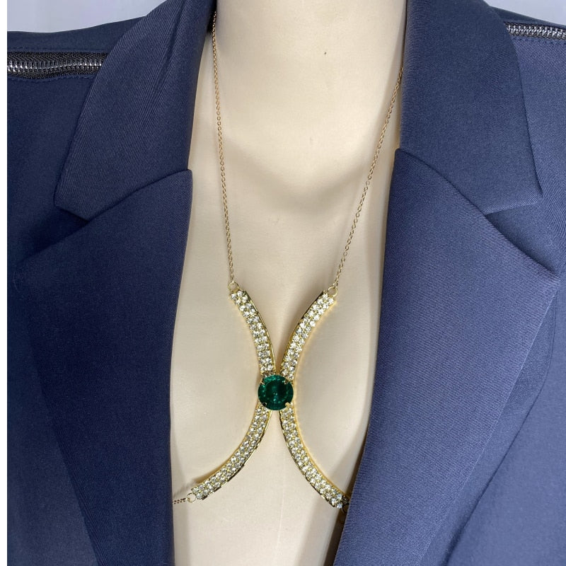 This is a one-of-a-kind product that you can wear with just about anything. This jewelry is made from zinc alloy, which is lightweight and durable. The necklace body jewelry has half-circles adorned with a round main rhinestone.