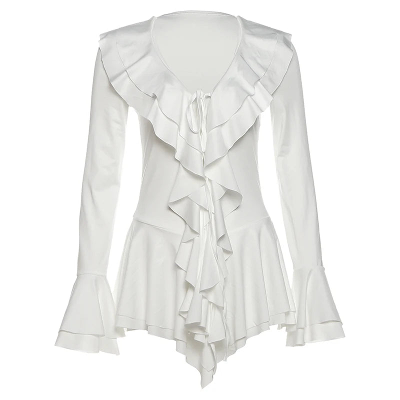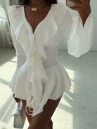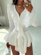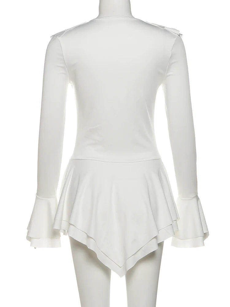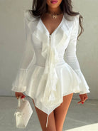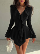 Make a fearless statement with the Harmony in Chaos Mini Dress. Designed with playful ruffles and crafted from a comfortable blend of polyester and spandex, this solid-colored dress hugs your silhouette while adding dynamic movement. It’s the perfect choice for those who embrace bold elegance with a touch of rebellious charm.