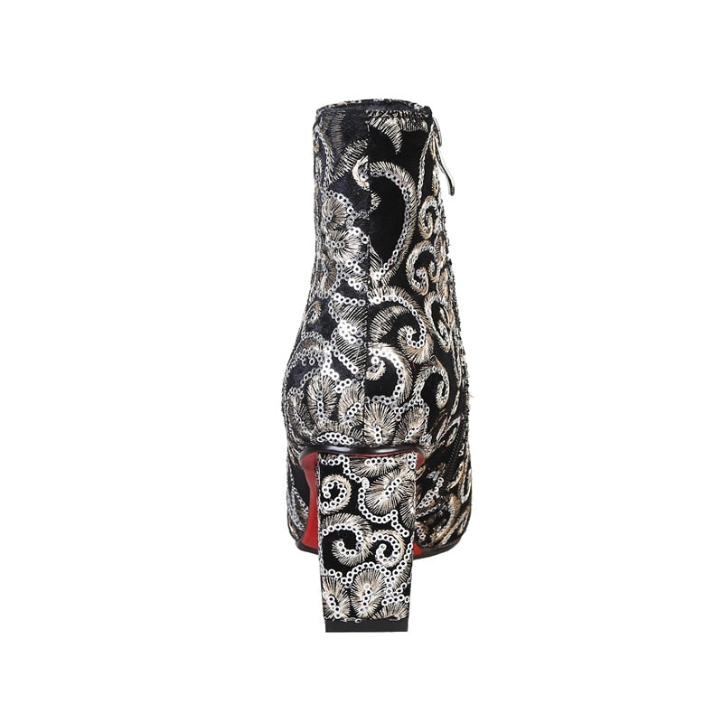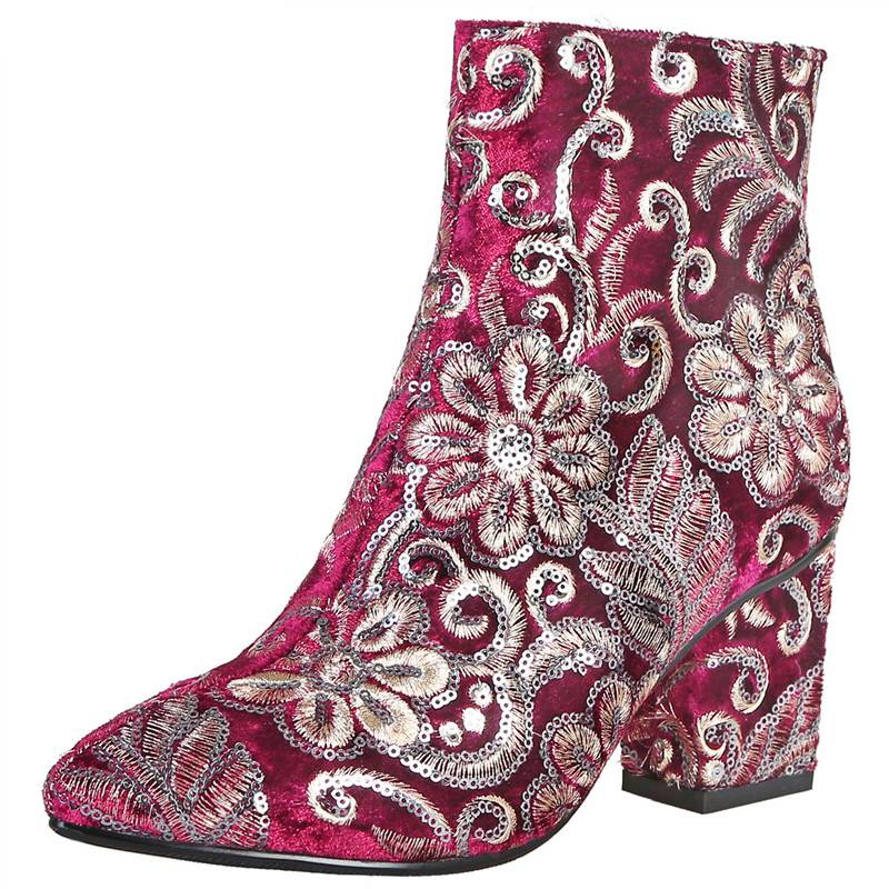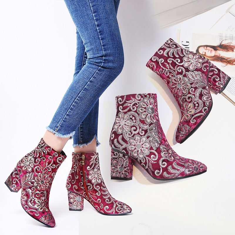 Botines de punta puntiaguda con bordado floral, tacón cuadrado, cierre de cremallera y material superior de microfibra