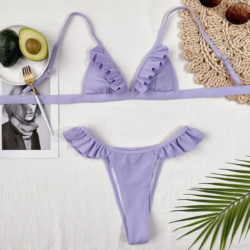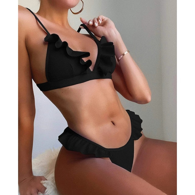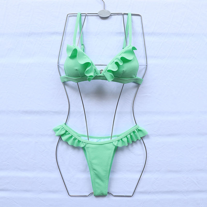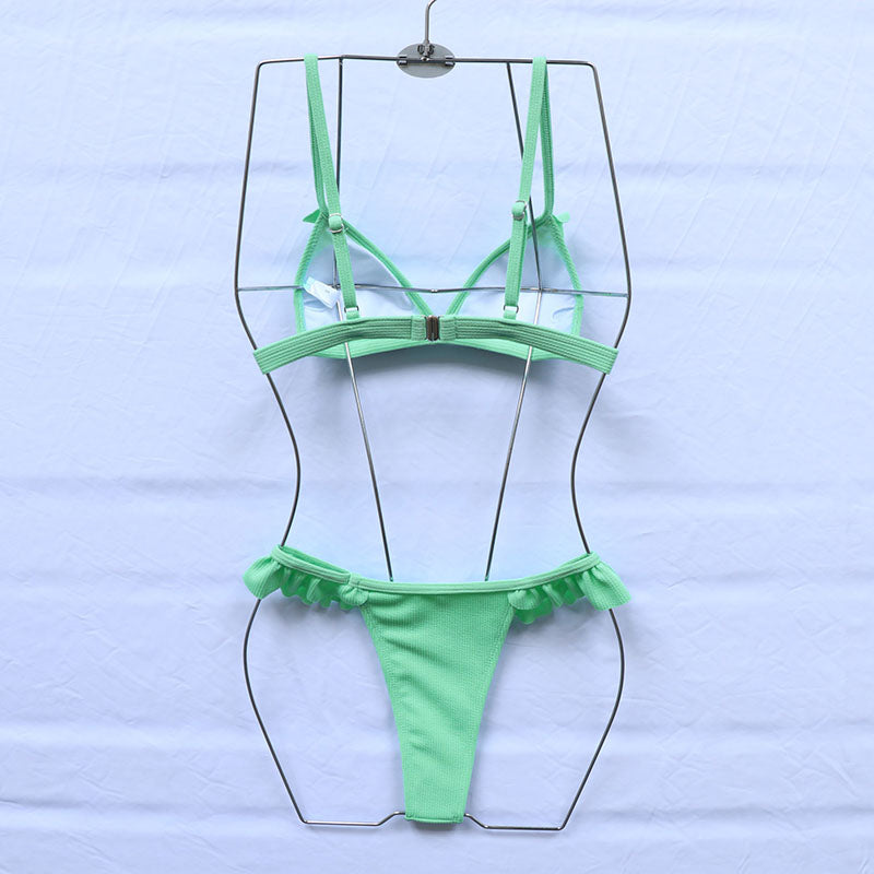 Bikini monocolor de dos piezas con decoración de volantes y tira ajustable