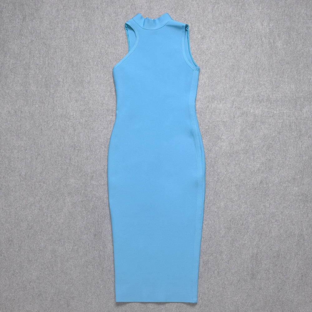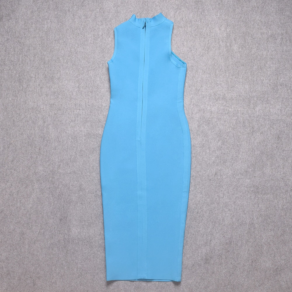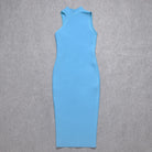An elegant sleeveless dress that is sure to become a favorite this season. This midi-length dress has an elegant and beautiful sky-blue color to show your feminine style. The flattering shape is enhanced with a turtleneck collar that gives off a modern look.