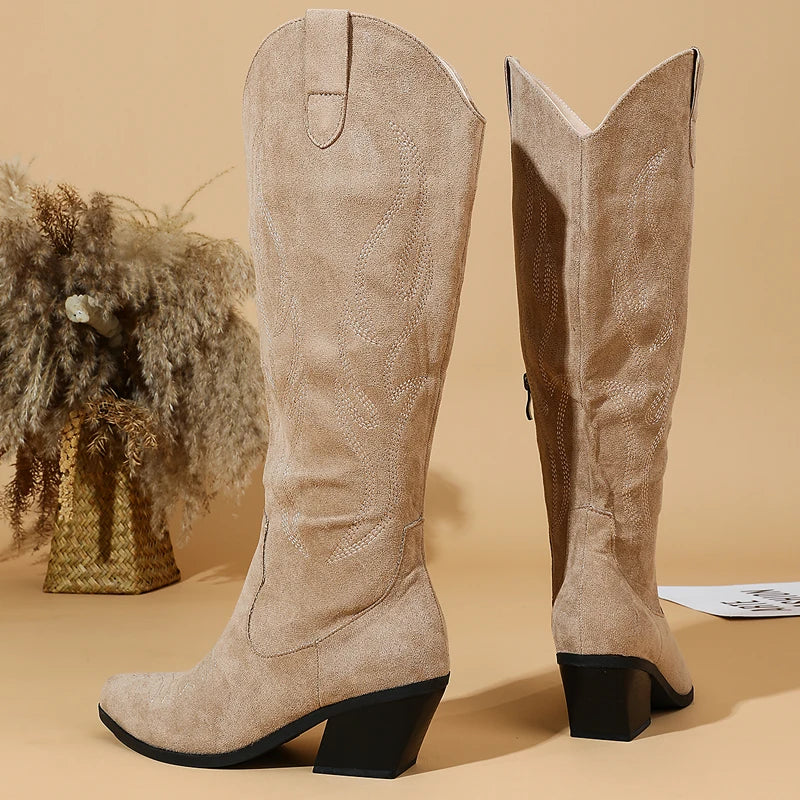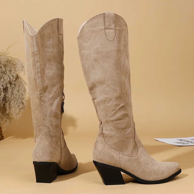 Elevate your footwear collection with these khaki flock knee-high boots, designed for both comfort and style. The soft flock texture adds a luxurious feel, while the convenient side zipper ensures easy on-and-off wear. Perfect for casual outings or dressier occasions, these versatile boots pair effortlessly with jeans, skirts, or dresses. The knee-high silhouette provides excellent support and coverage, making them an essential addition to any wardrobe.