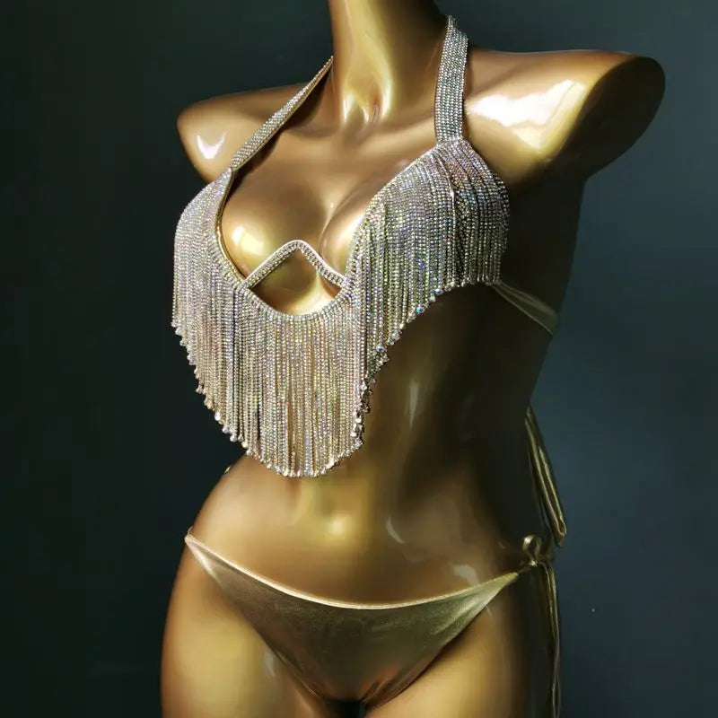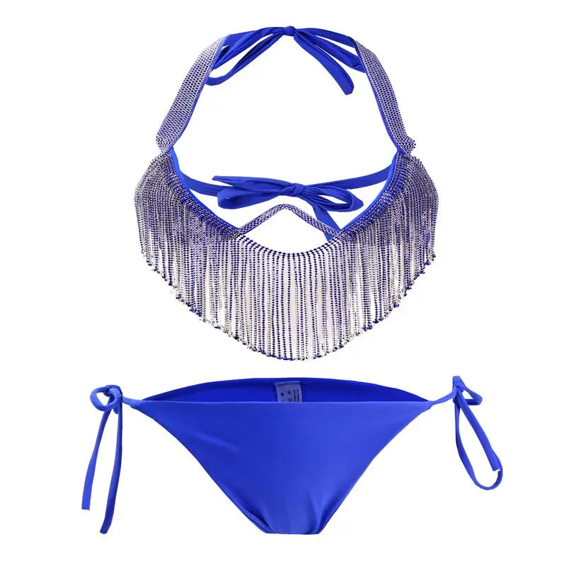 The Kiss The Sunrise Bikini combines sleek spandex with eye-catching tassels and sparkling rhinestones for a bold beach statement. Designed to highlight your confidence, it hugs your curves while dazzling under the sun, perfect for turning heads and owning every sunrise moment.