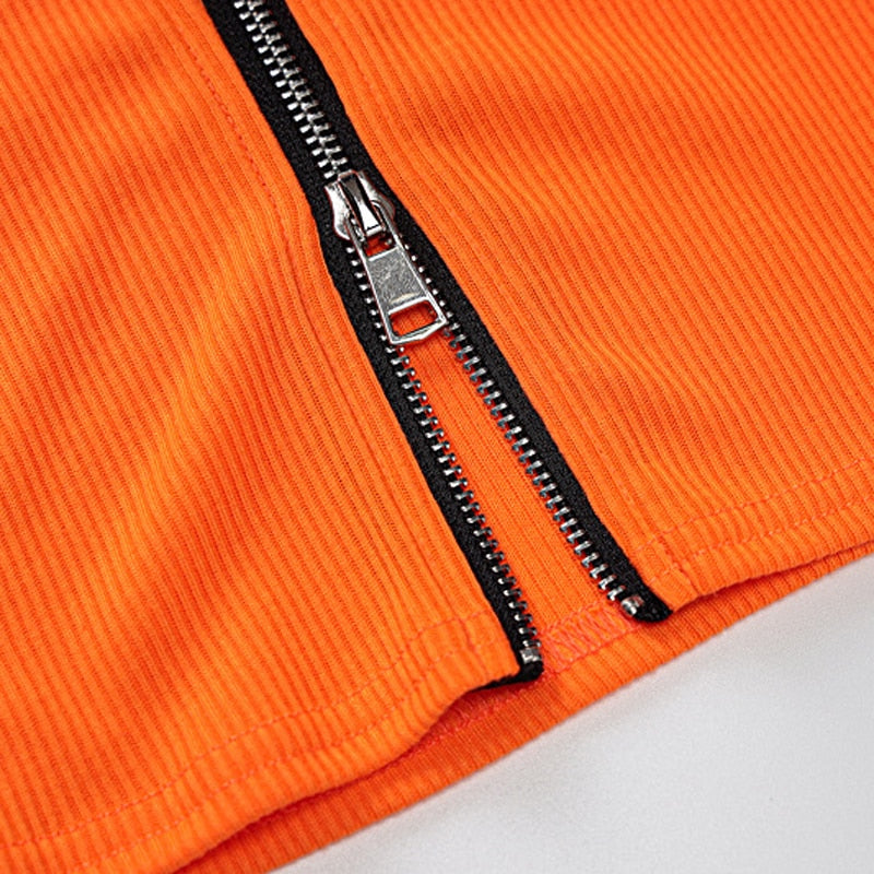 A wardrobe staple, this versatile top is a great way to look stylish and stay cool. With a front zipper closure, it's easy to get on and off without the hassle of buttons. The simple turtleneck collar adds a stylish detail that is sure to become a classic. The bright orange color provides a pop of color to any outfit.