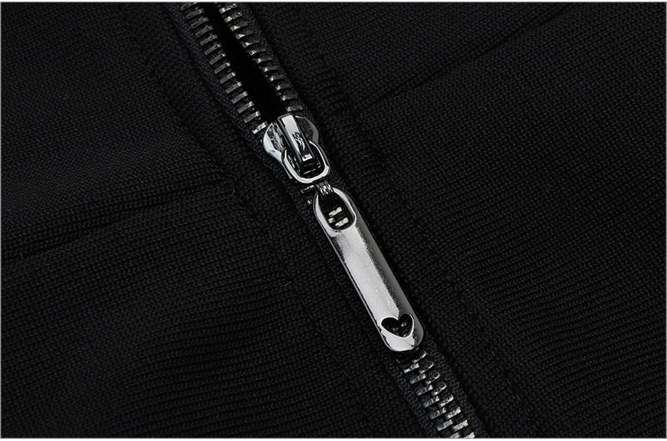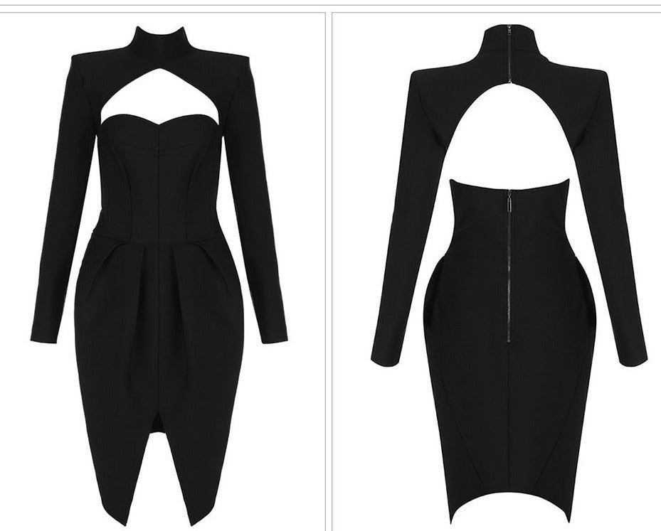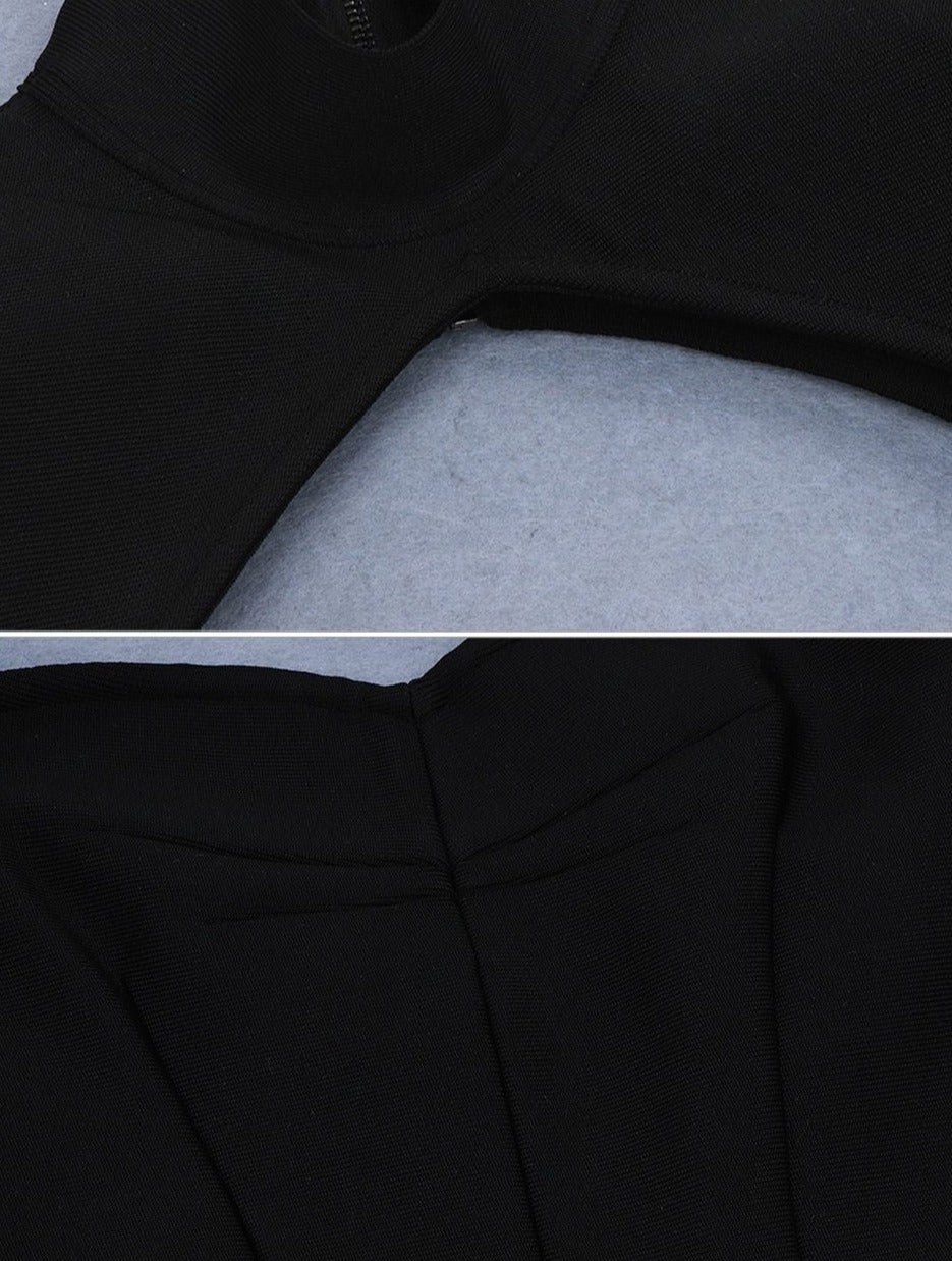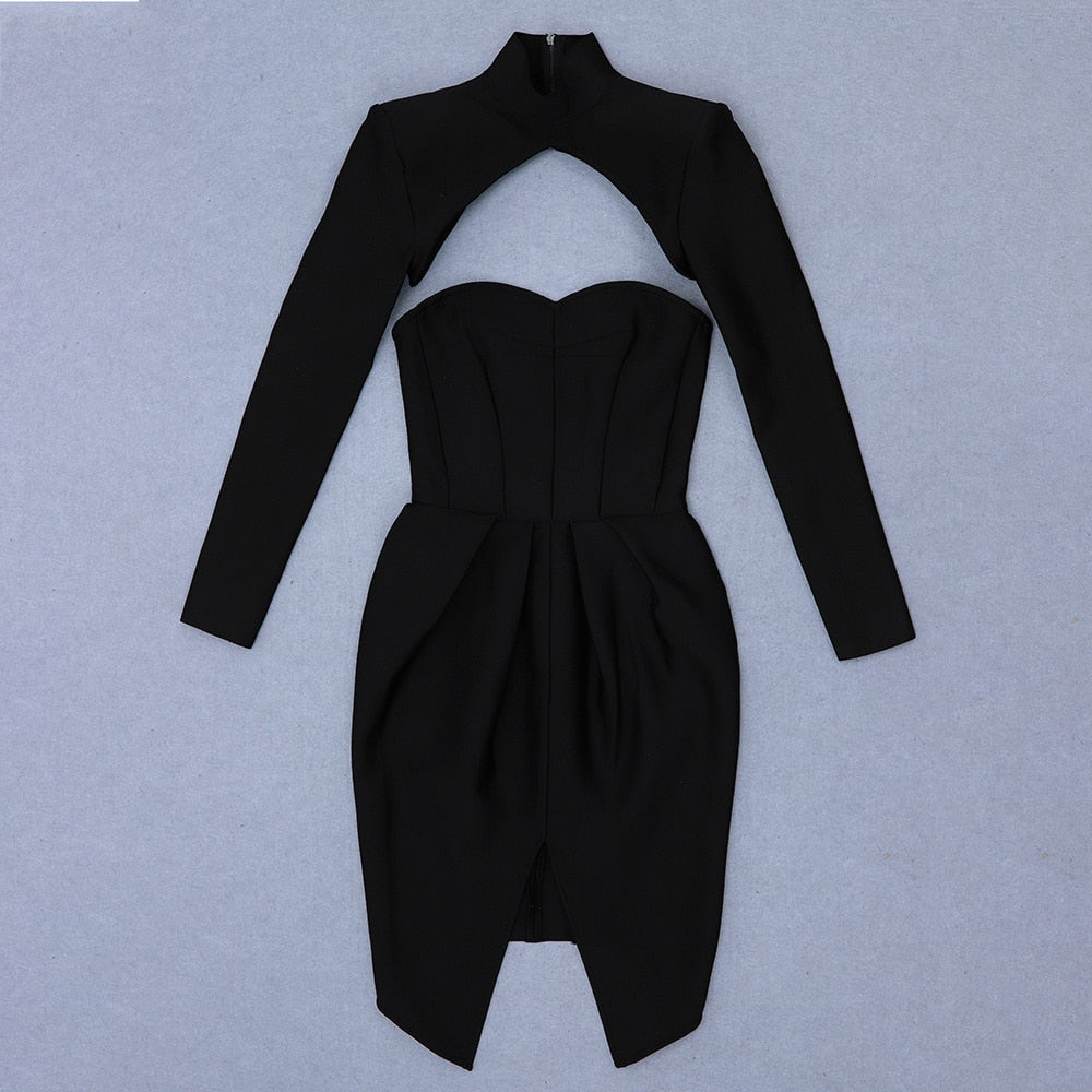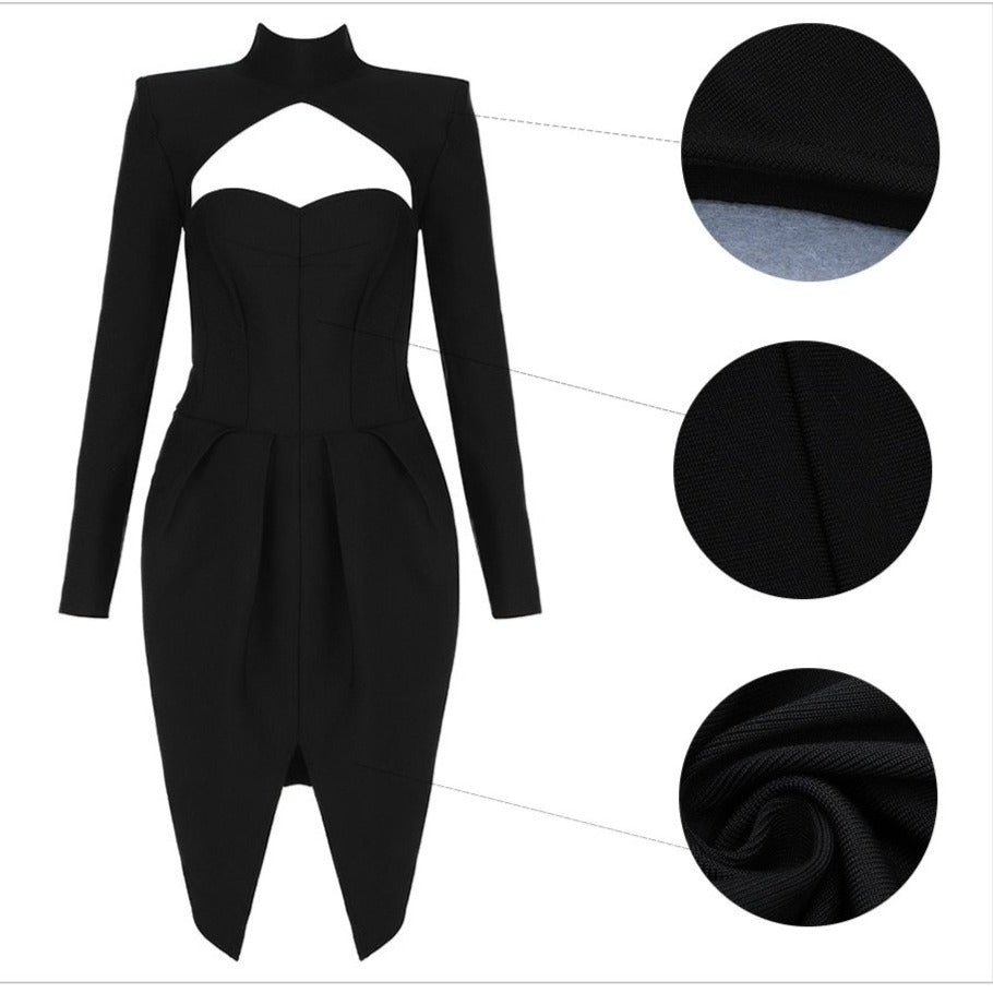 Minivestido de poliéster negro liso con manga larga, cuello de tortuga, cierre de cremallera y decoración plisada