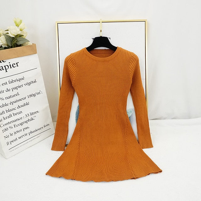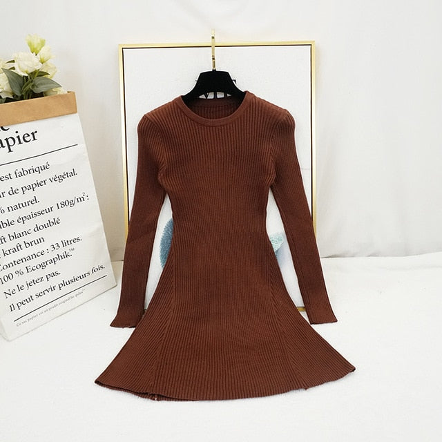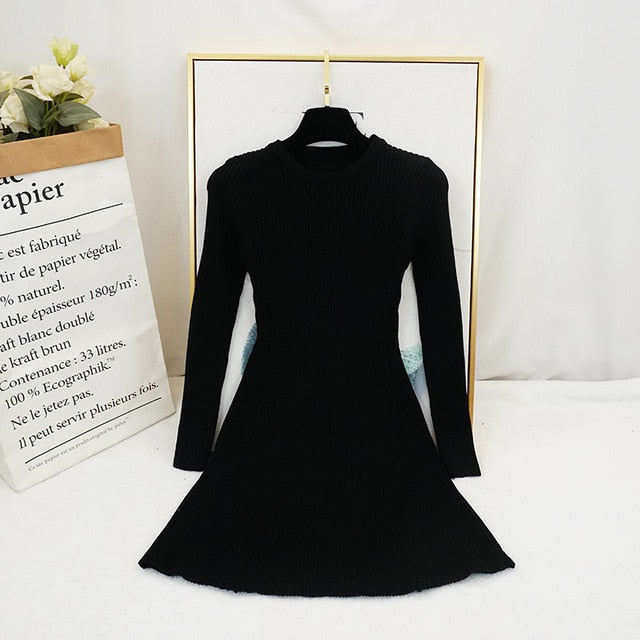 Minivestido liso de manga larga con cuello redondo y material acrílico de nailon