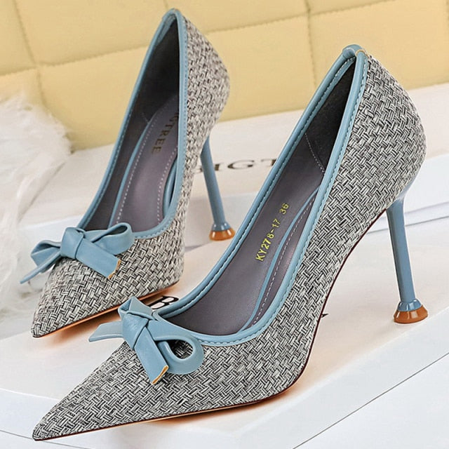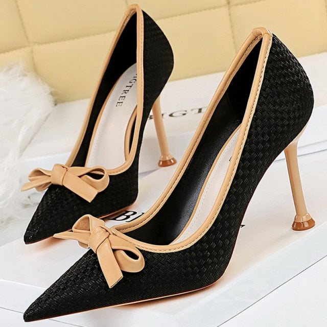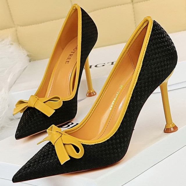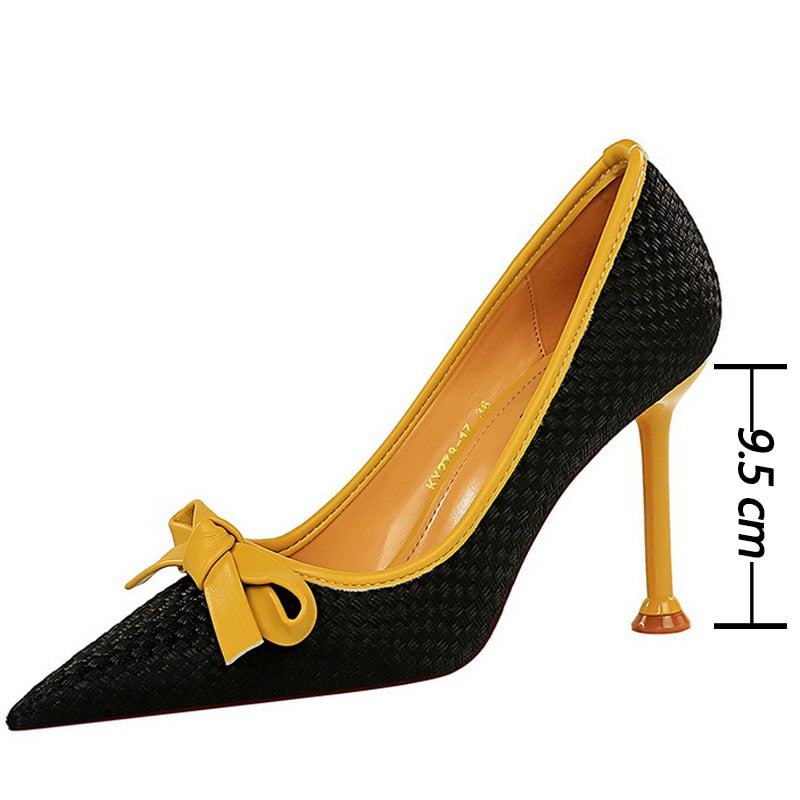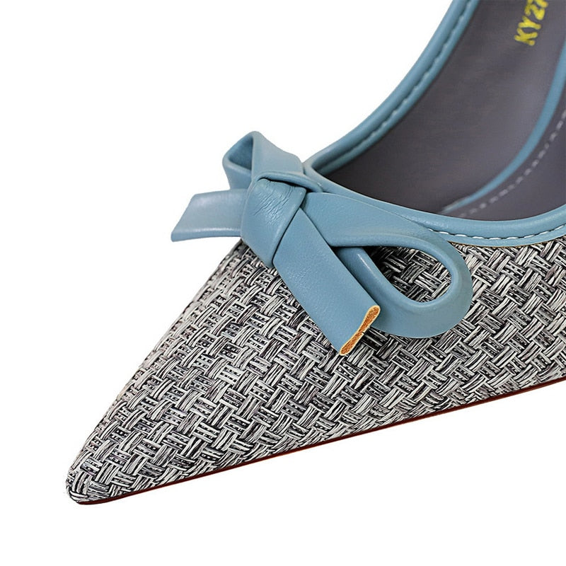 Zapatos de salón decorados con cinta con patrón geométrico, punta puntiaguda y material de PU