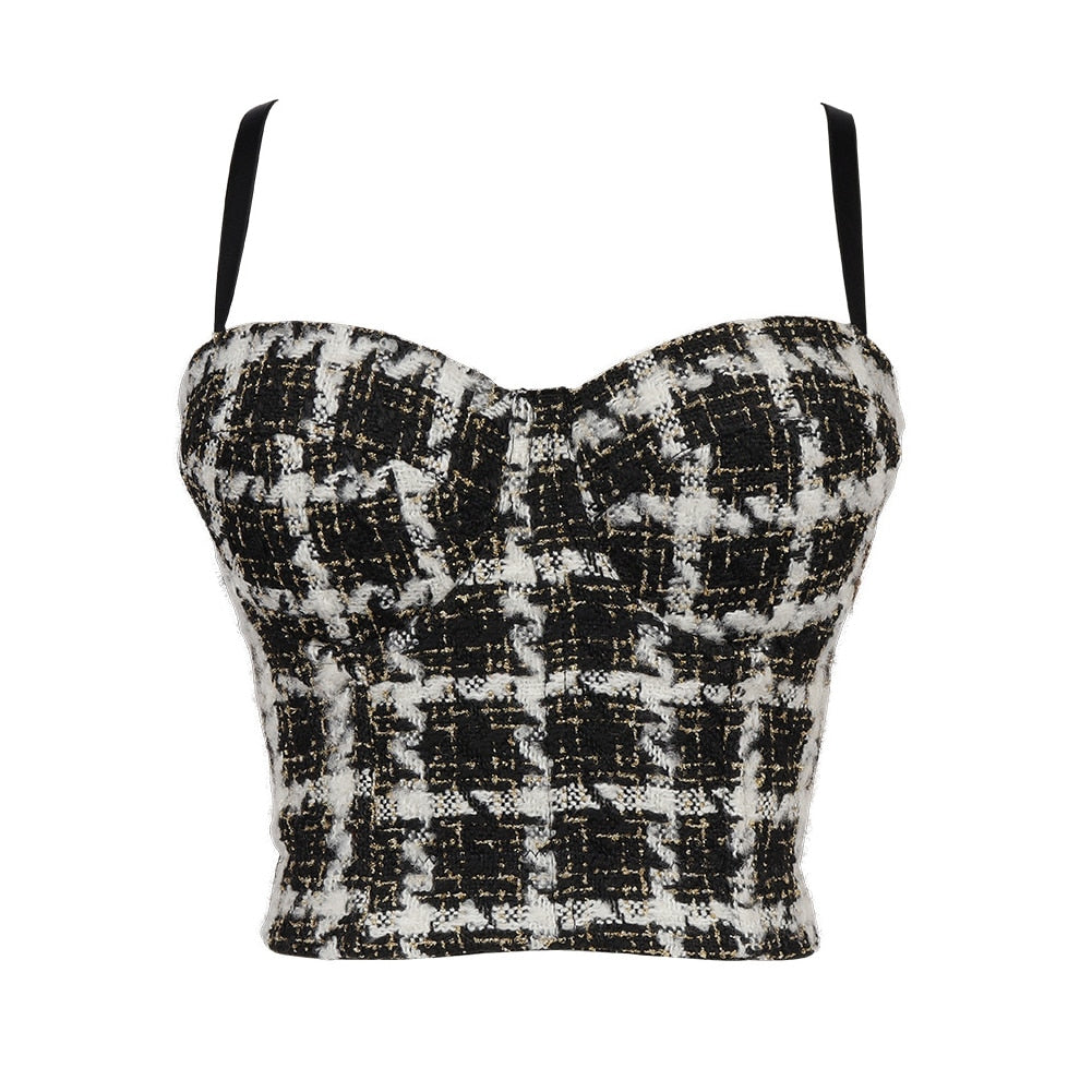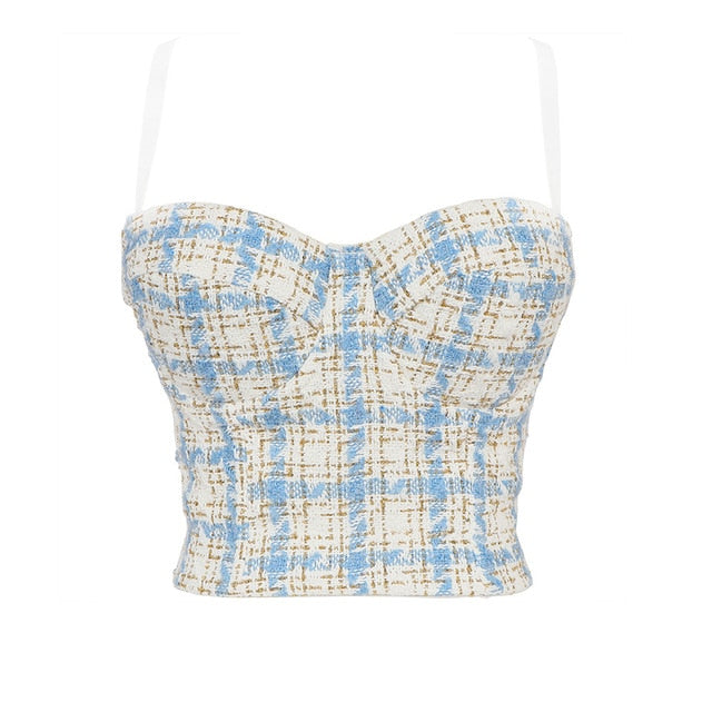 Top corto de licra y poliéster acrílico con tirantes finos y patrón a cuadros