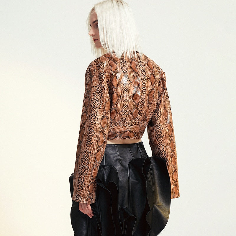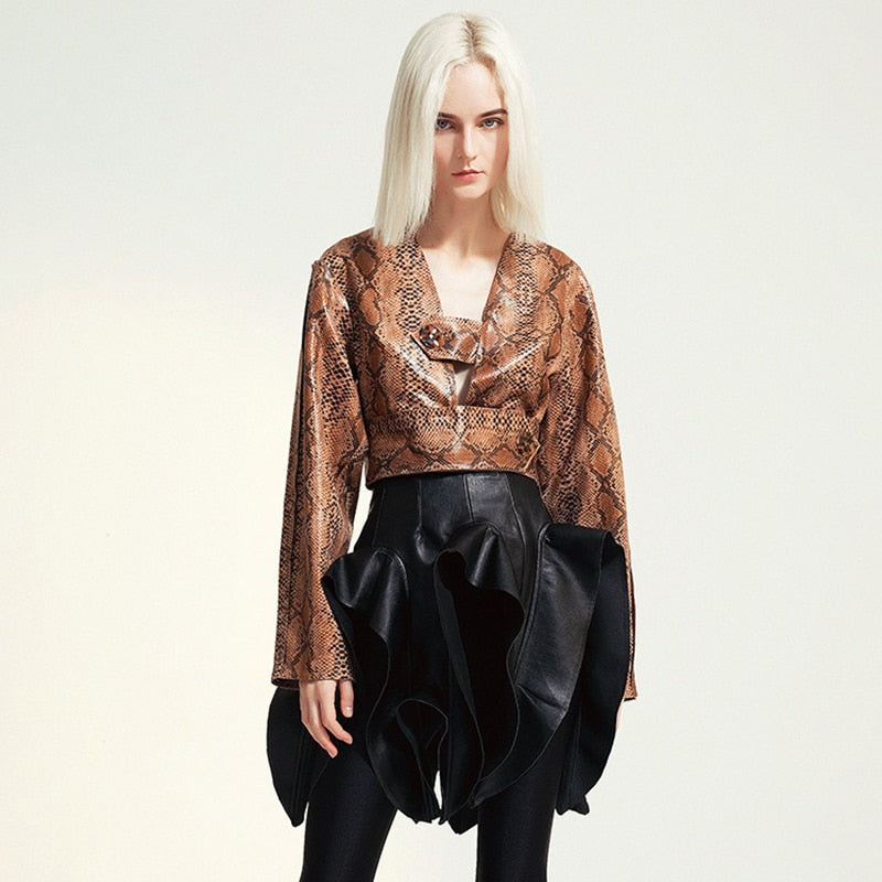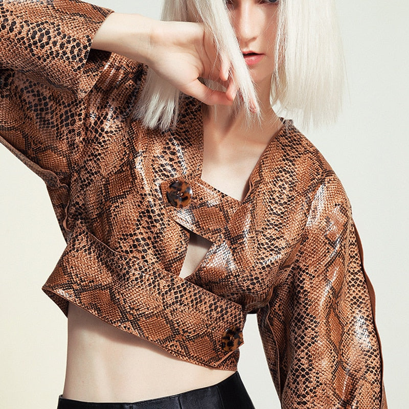 Blusa de PU de manga larga con estampado de piel de serpiente, cuello en V y cierre de un solo pecho