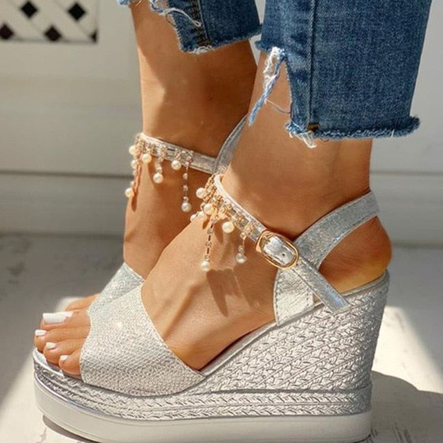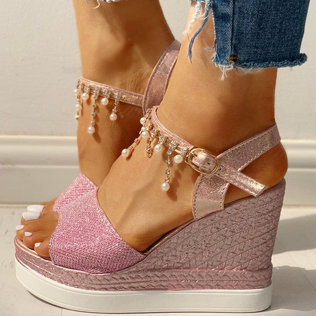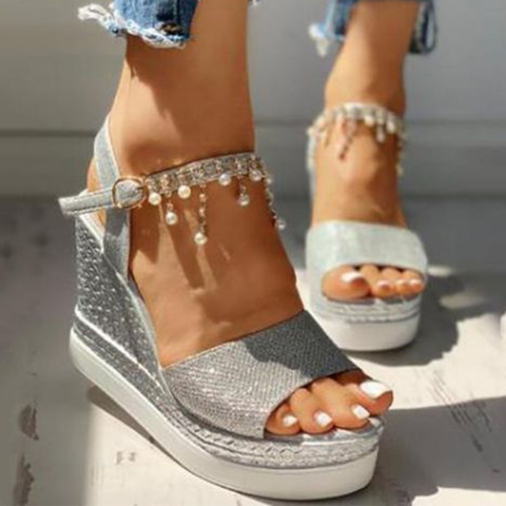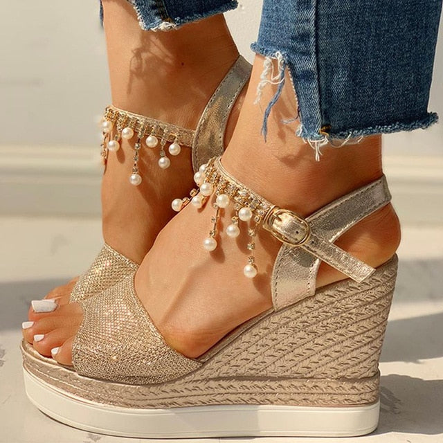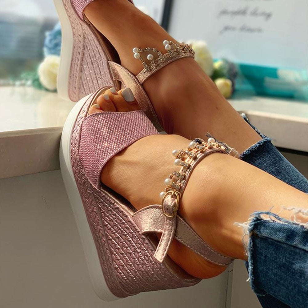 Sandalia de tacón con cuñas y correa de tobillo con decoración de perlas de microfibra