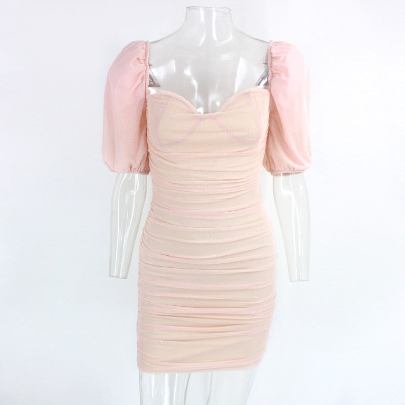 Minivestido de poliéster en vaina con cuello cuadrado y mangas abullonadas