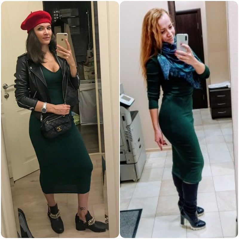 Vestido largo de manga larga con cuello en V de poliéster y licra