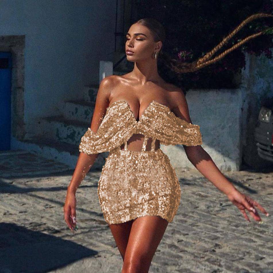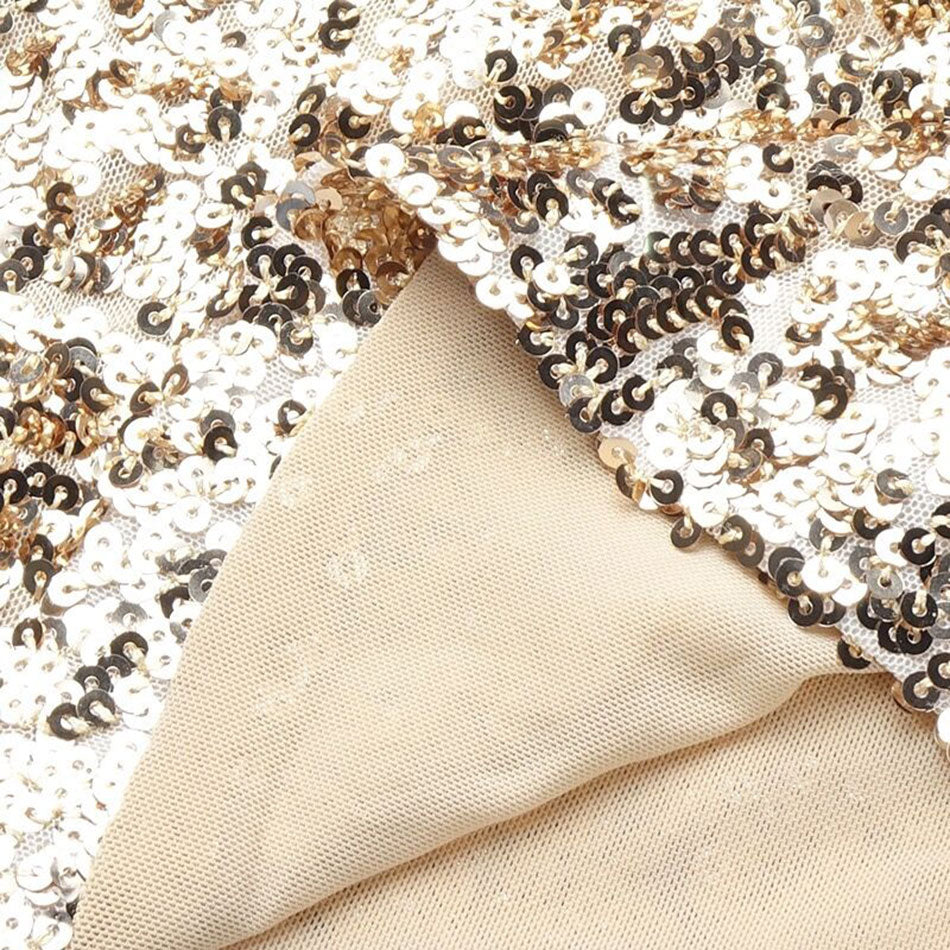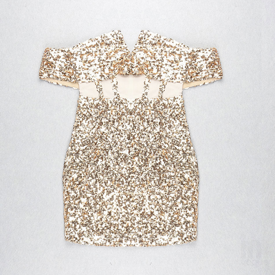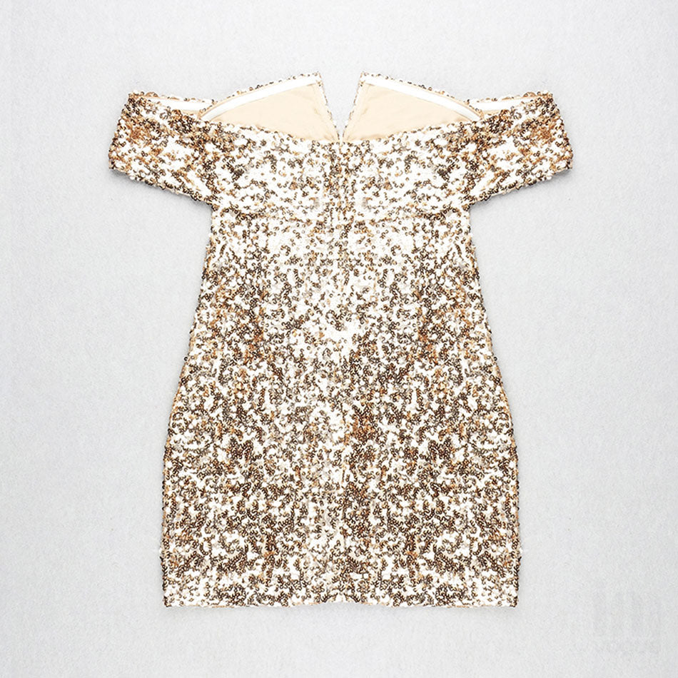 When you're looking for a fun and flirty style, look no further than this mini dress. This dress is made of polyester material. The luxurious gold sequined design is a glamorous option to take your look to the next level. Off-shoulder short sleeves in a drape style ensure that you stay cool and comfortable. It also features a see-through waist empire design that is sure to be a showstopper.