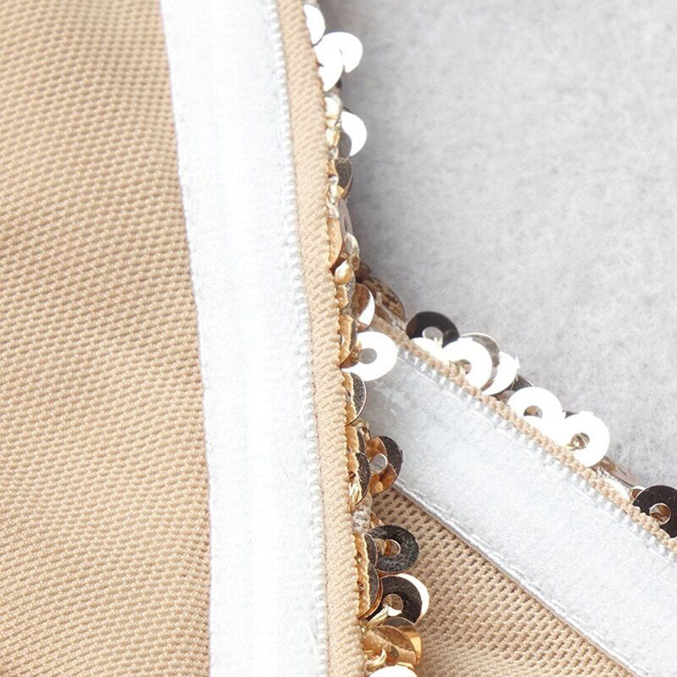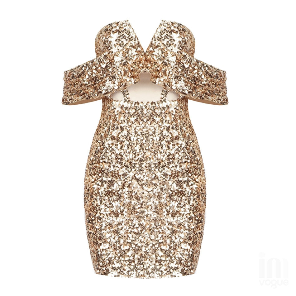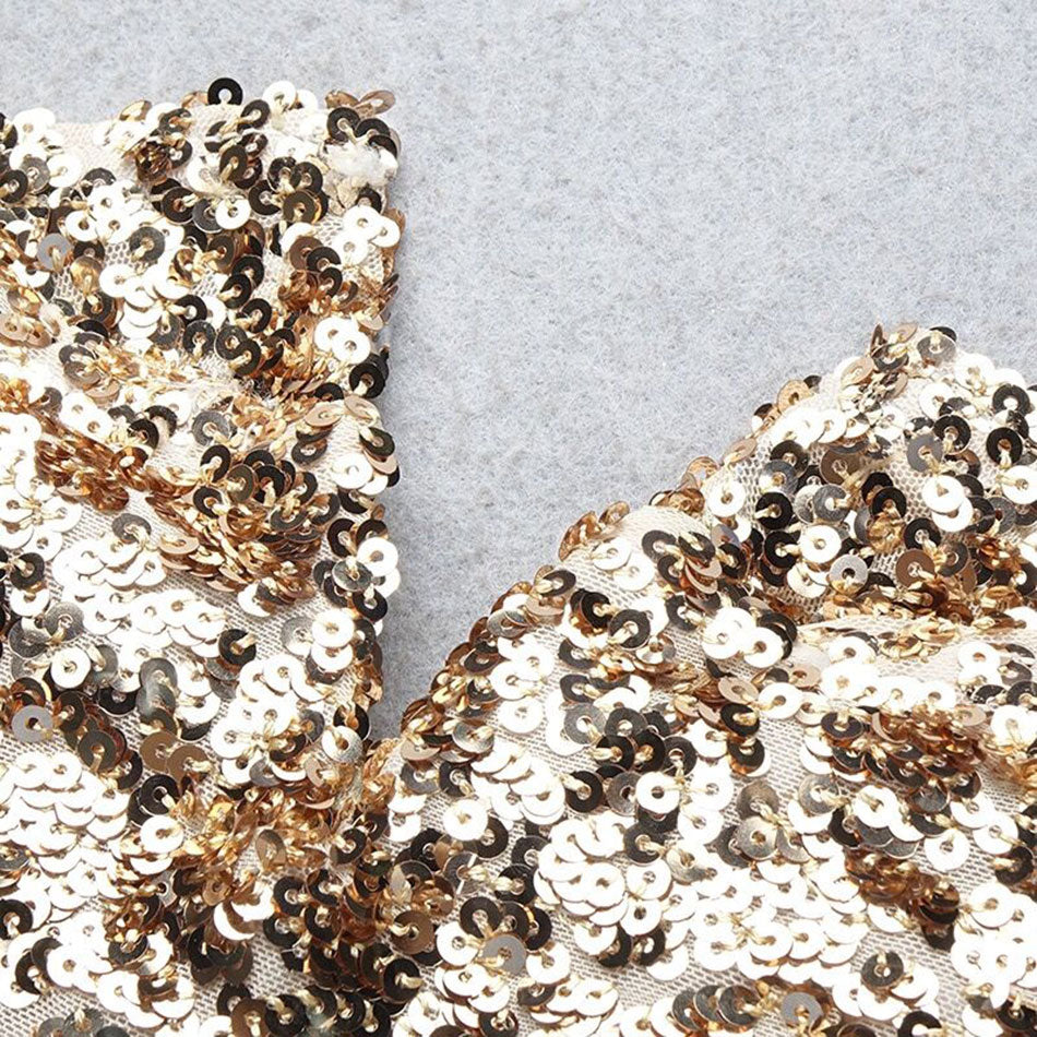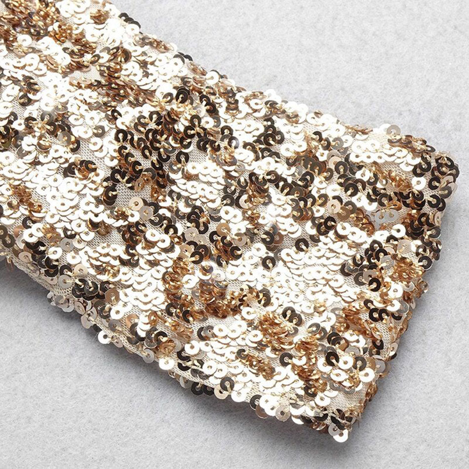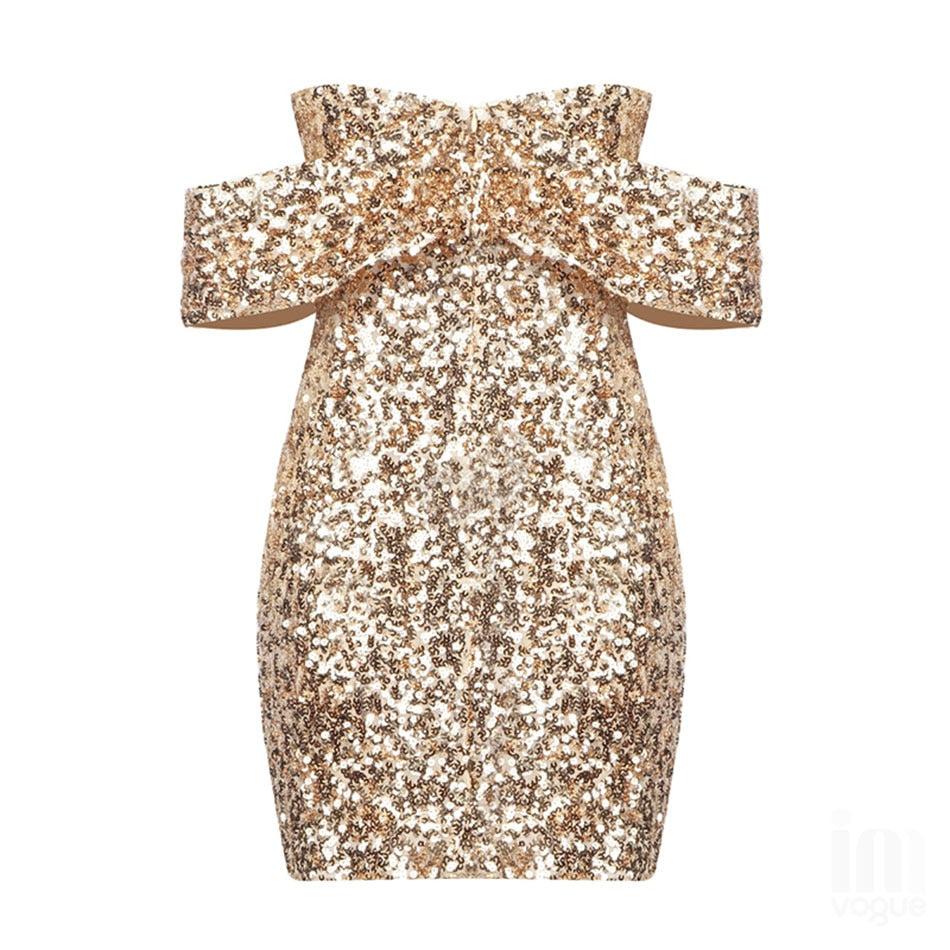 When you're looking for a fun and flirty style, look no further than this mini dress. This dress is made of polyester material. The luxurious gold sequined design is a glamorous option to take your look to the next level. Off-shoulder short sleeves in a drape style ensure that you stay cool and comfortable. It also features a see-through waist empire design that is sure to be a showstopper.