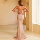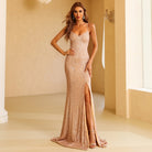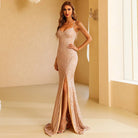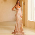 Vestido largo de lentejuelas con tirantes finos y cierre de cordones