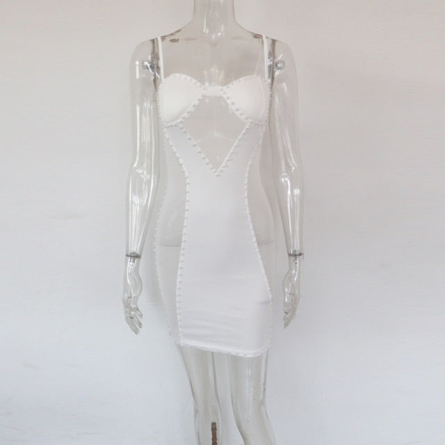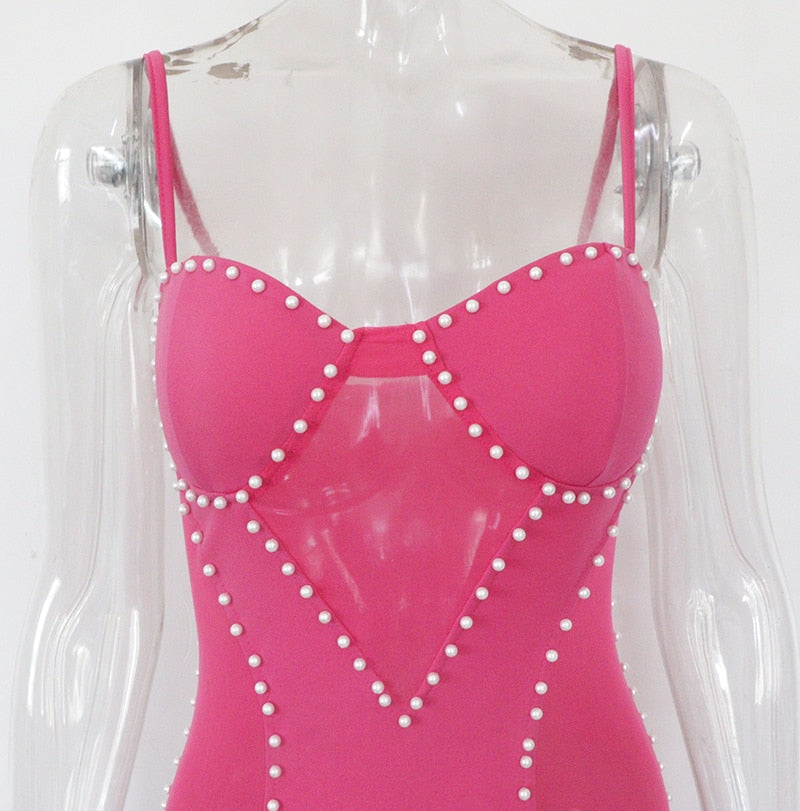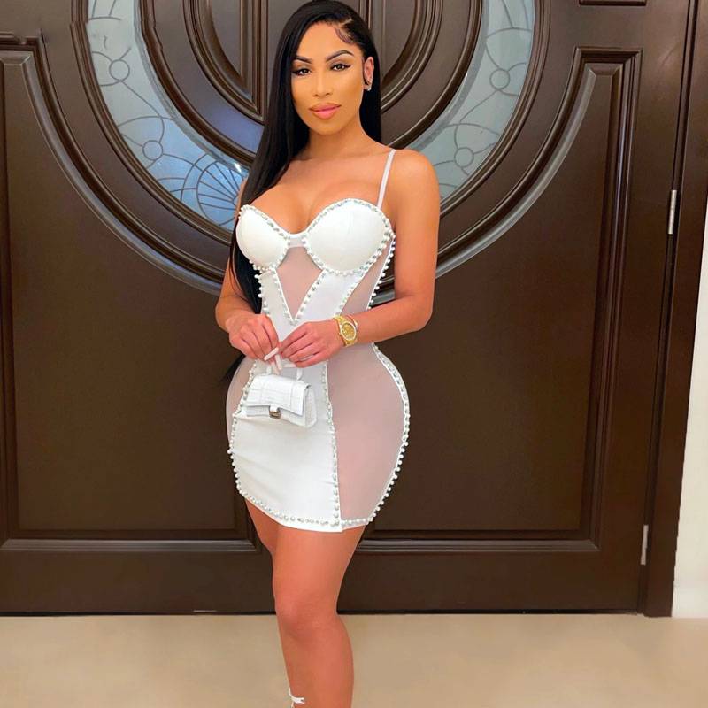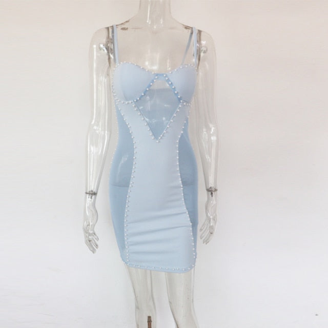 Minivestido tipo jersey sin mangas con patchwork transparente y decoración de abalorios