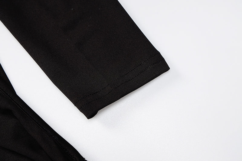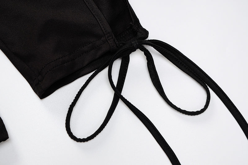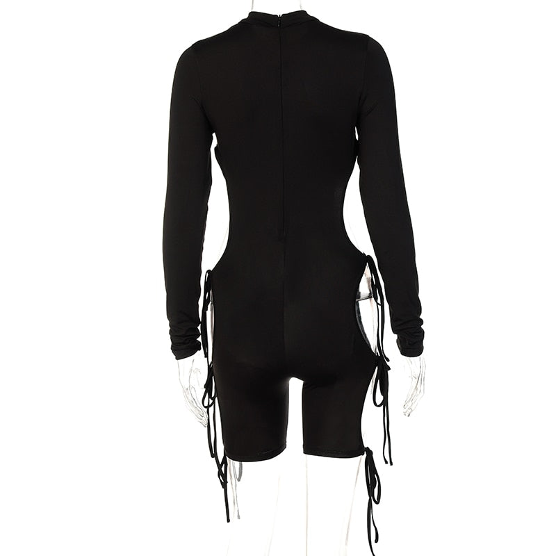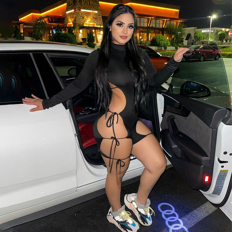 A fashionable long-sleeved romper for girls who love hollow-out design. This romper is available in black color, which has the effect of making the wearer look slim and sensual. The string decoration adds a romantic touch.
