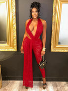 Unleash your boldest self in this daring backless V-neck lace jumpsuit. Crafted from a luxurious polyester and spandex blend, it hugs your curves with confidence while the plunging neckline and open back create an unforgettable silhouette. The delicate lace detailing adds an alluring touch of sophistication. Perfect for nights when you're ready to turn heads and make a statement. Stretch fabric ensures comfort without compromising that show-stopping look.