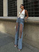 Break the rules with these provocative sheer mesh knee panel jeans that blend edgy transparency with classic denim. Strategic mesh cutouts at the knees create an alluring peek-a-boo effect, transforming ordinary jeans into a fearless fashion statement. High-waisted for flattering support, these jeans demand confidence and reward it with undeniable presence. Style with a structured blazer for sophisticated rebellion, or go full daring with a crop top.