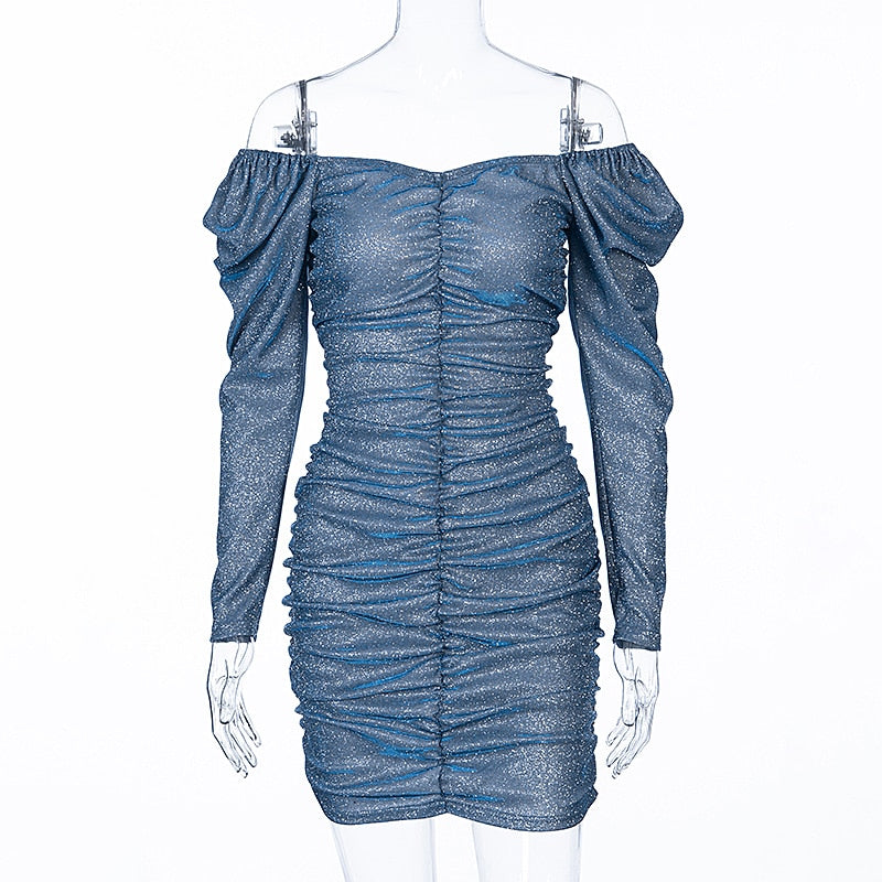 <transcy>Minivestido de mujer de manga larga con lentejuelas y cuello oblicuo brillante</transcy>