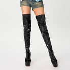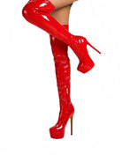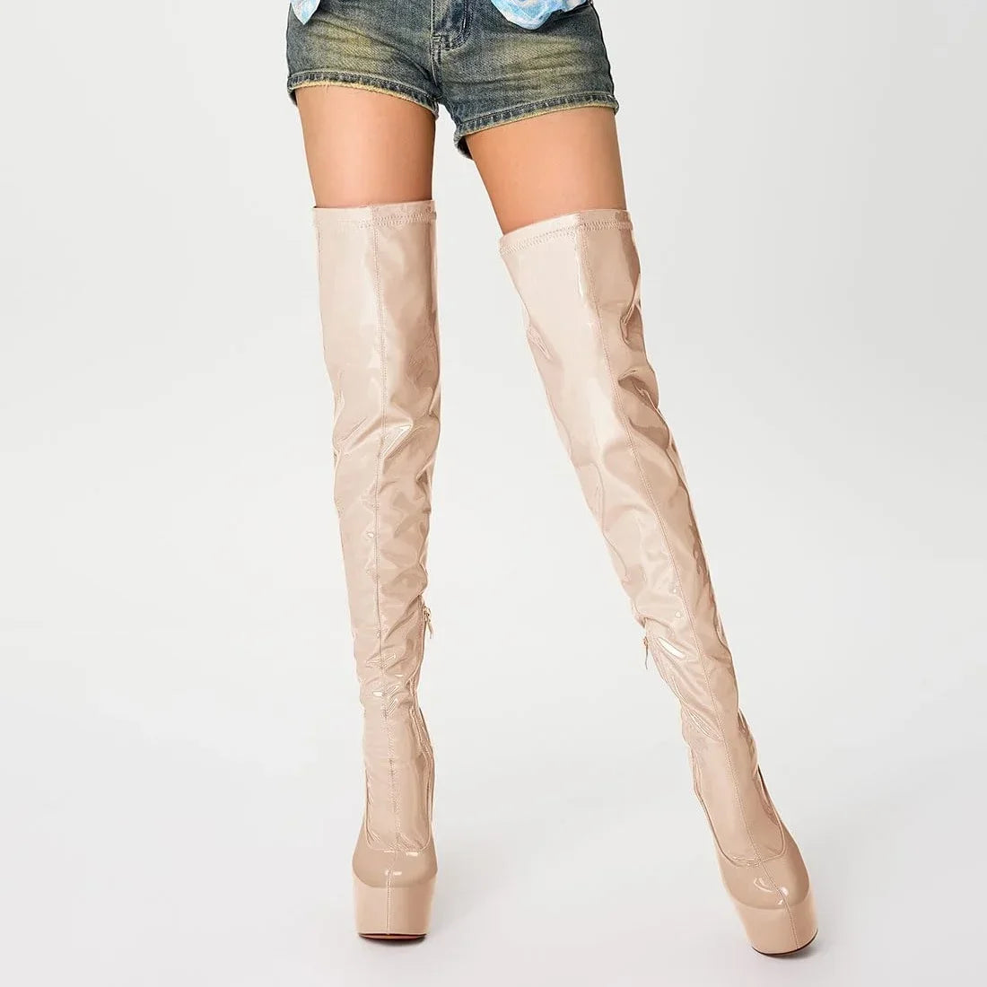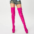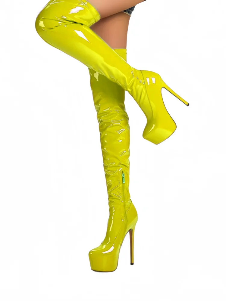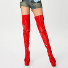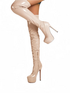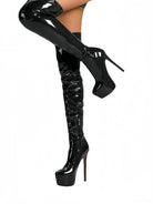 Elevate your stride with these audacious over-the-knee boots that command attention. Crafted from lustrous patent leather, they deliver an unmistakable shine that catches every eye. The platform sole adds both attitude and comfort, while the thigh-high silhouette makes a bold fashion statement. Perfect for those ready to turn heads and own the room with confidence and edge.