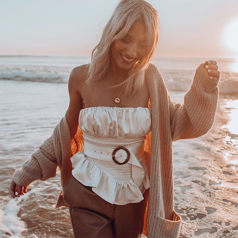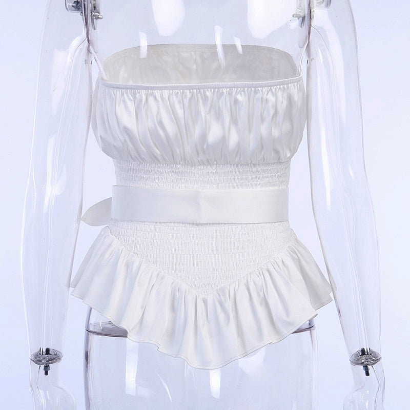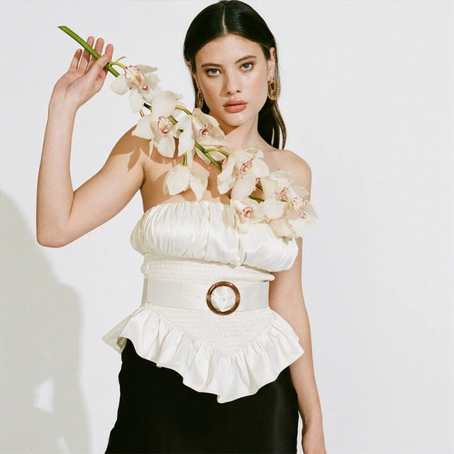 <transcy>Blusas de volantes de mujer sin mangas con anillo plisado de color sólido</transcy>