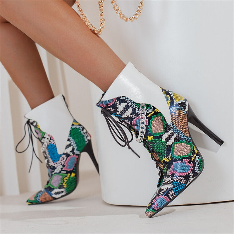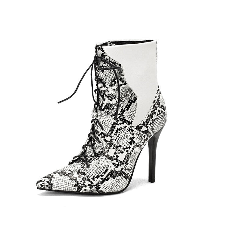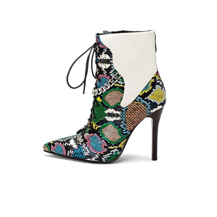 This women's ankle boot is a beautiful, versatile design that works with a variety of outfits. Made with a soft, comfortable material and a pointed toe, it can be worn both casually and dressy for the perfect mix of looks. The zippered closure makes it easy to take on and off. The stylish animal skin pattern is a unique and flattering finish that's sure to grab attention from all angles.