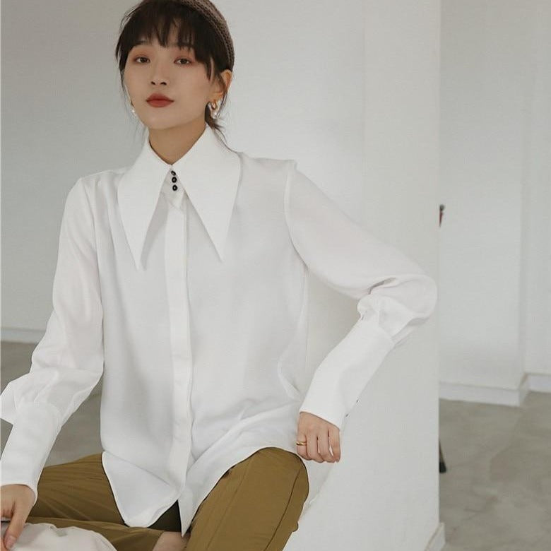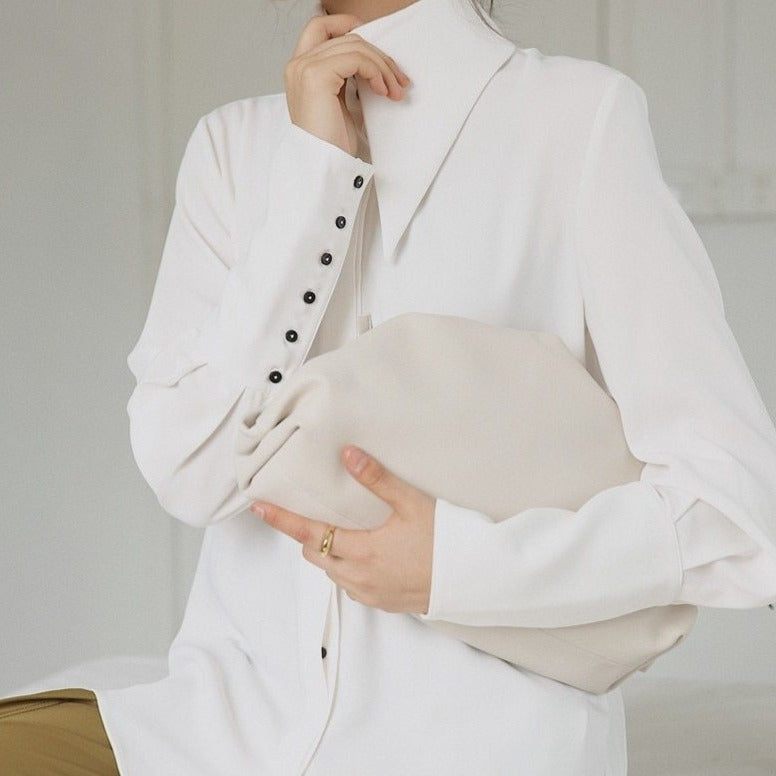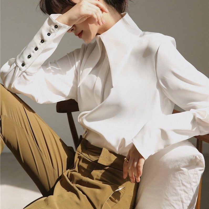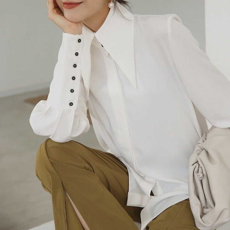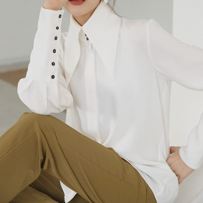 Camisa de manga larga tipo farol con cuello vuelto y decoración de botones