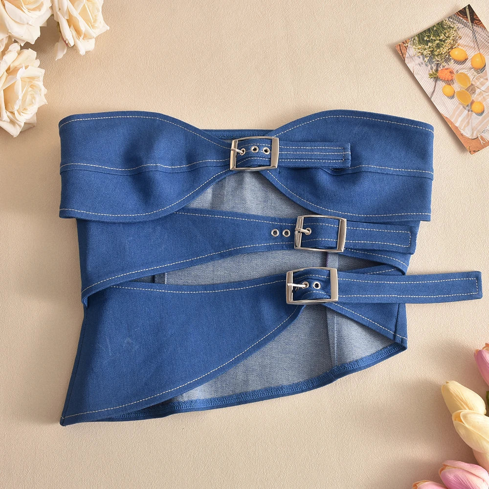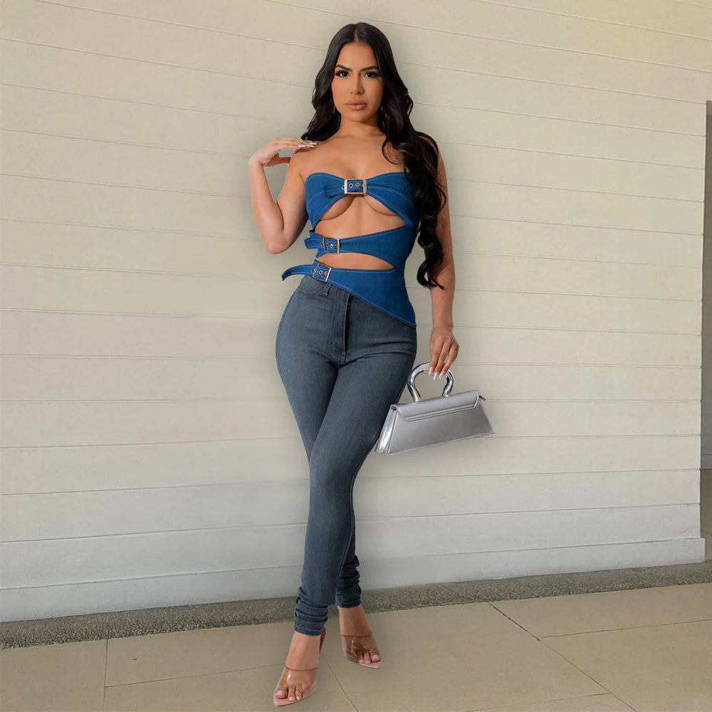 Enhance your summer look with our Sun-Kissed Body Crop Top! Made with comfortable denim material and adorned with a sexy hollow out design, this top will highlight your figure and make you stand out. Perfect for a day at the beach or a night out on the town.